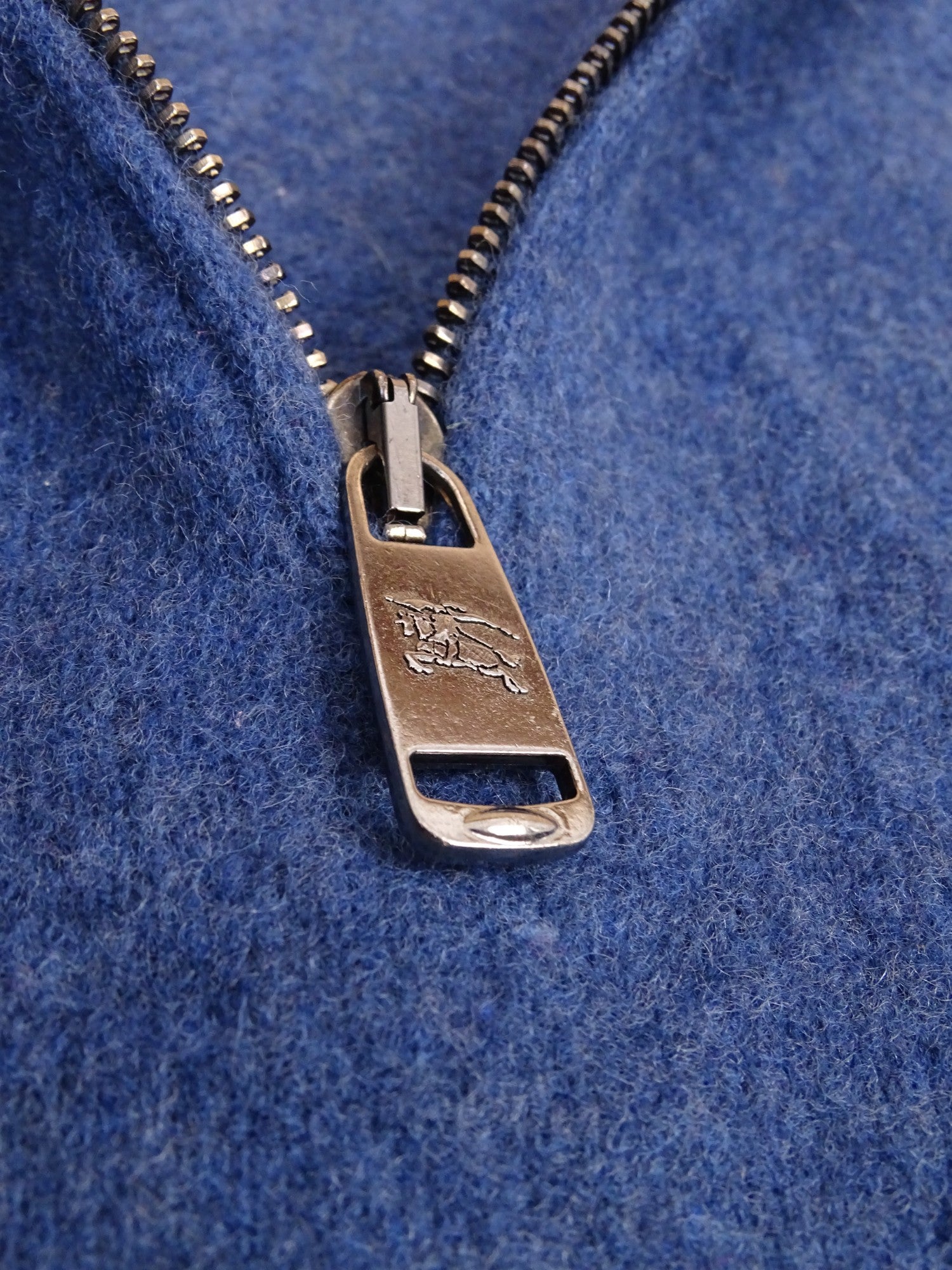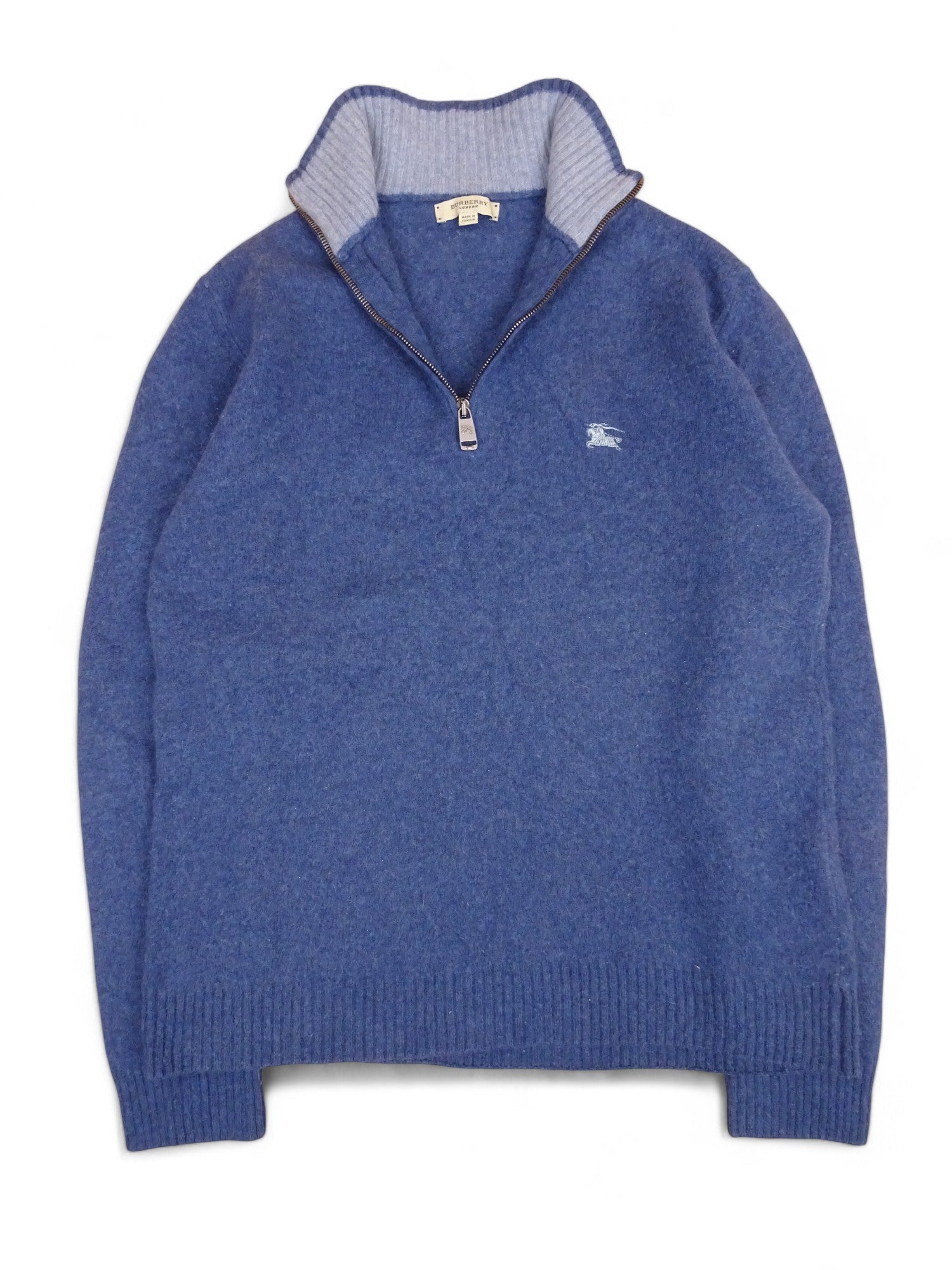 Pull Burberry half zip col montant, bleu, en laine, taille S homme. Légèrement feutré (voir photos).