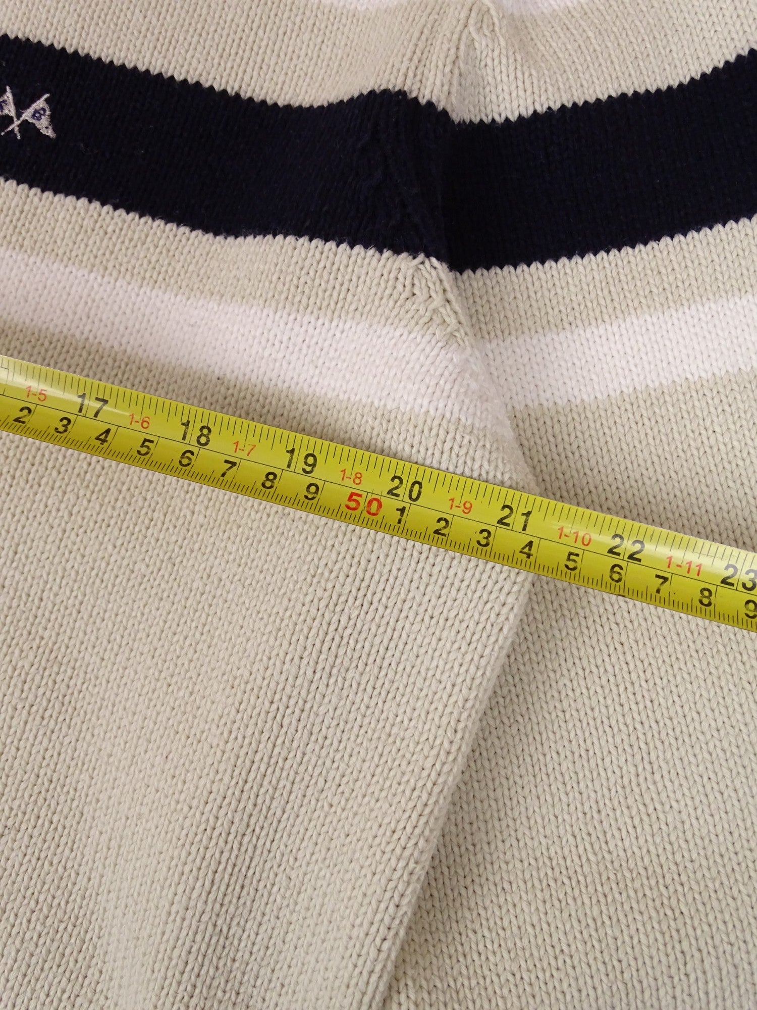 Pull Burberry à rayures beige et bleu marine, pour homme, taille XL, 60 % coton. Très bon état général ; petites traces discrètes sur l’avant et sur une manche (voir photos). Mesures détaillées en images.