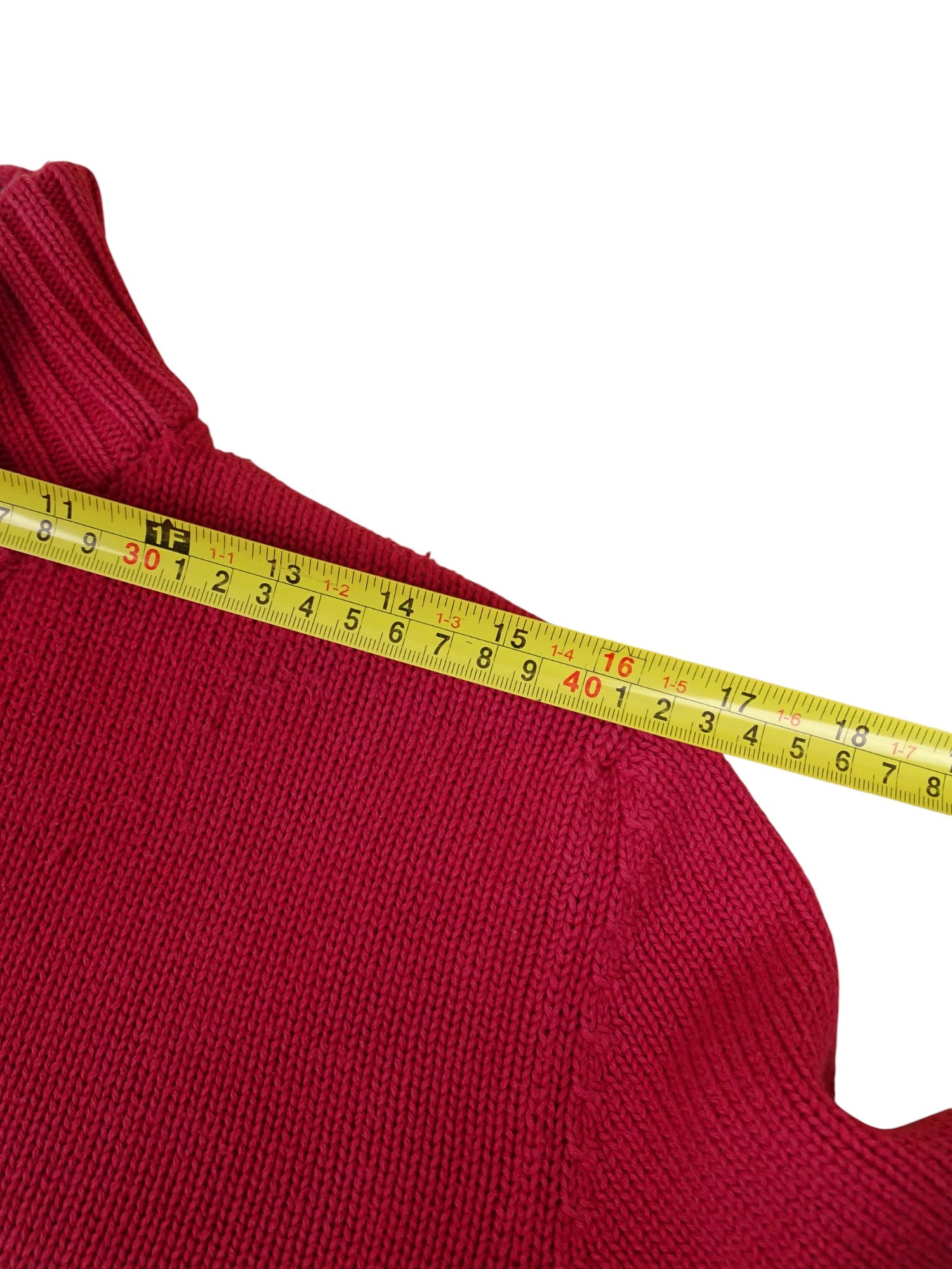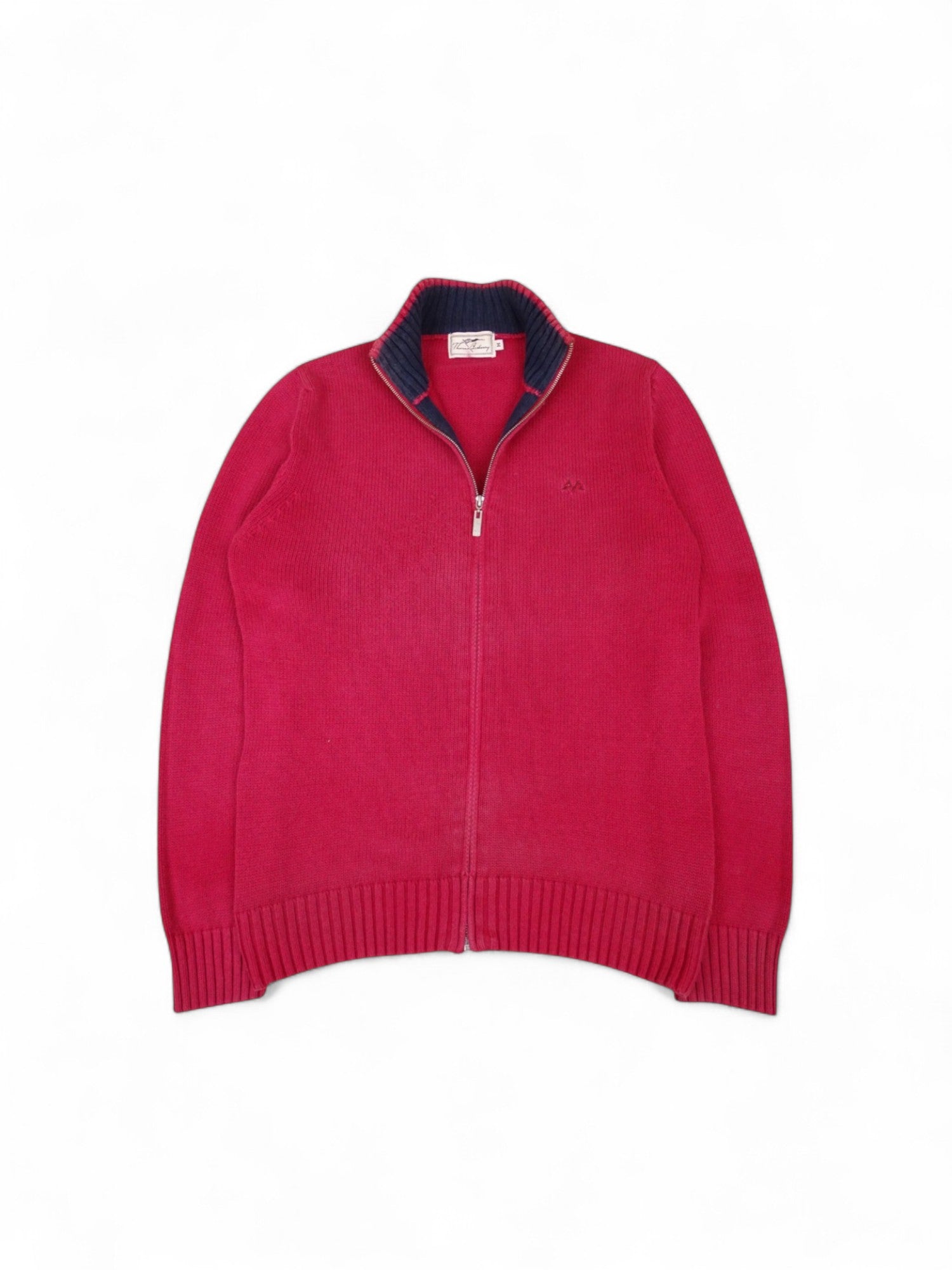 Condition de l'article : Bon état. Pull sweat zippé de couleur rouge et bleu marine. Porté plusieurs fois, il est légèrement délavé mais ne présente pas de défaut particulier.