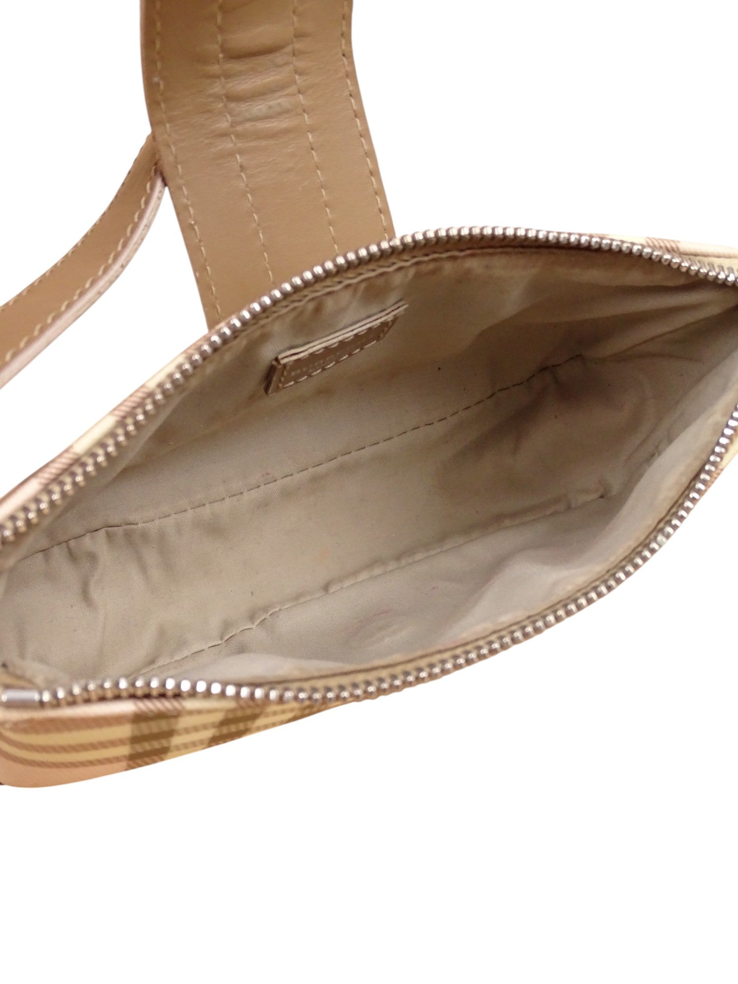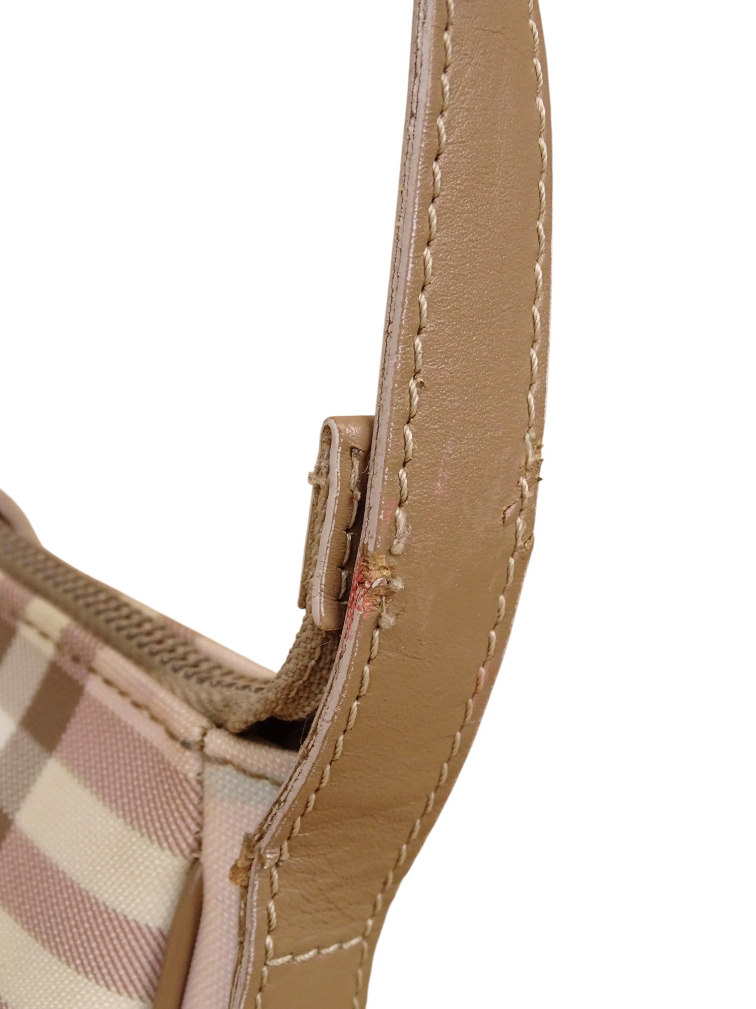 Condition de l'article : Très bon état. Mini sac baguette Burberry à porter à l'épaule, avec le célèbre motif tartan décliné en rose, beige et blanc. Format compact, parfait pour l’essentiel. Il présente de très légères traces peu visibles.
