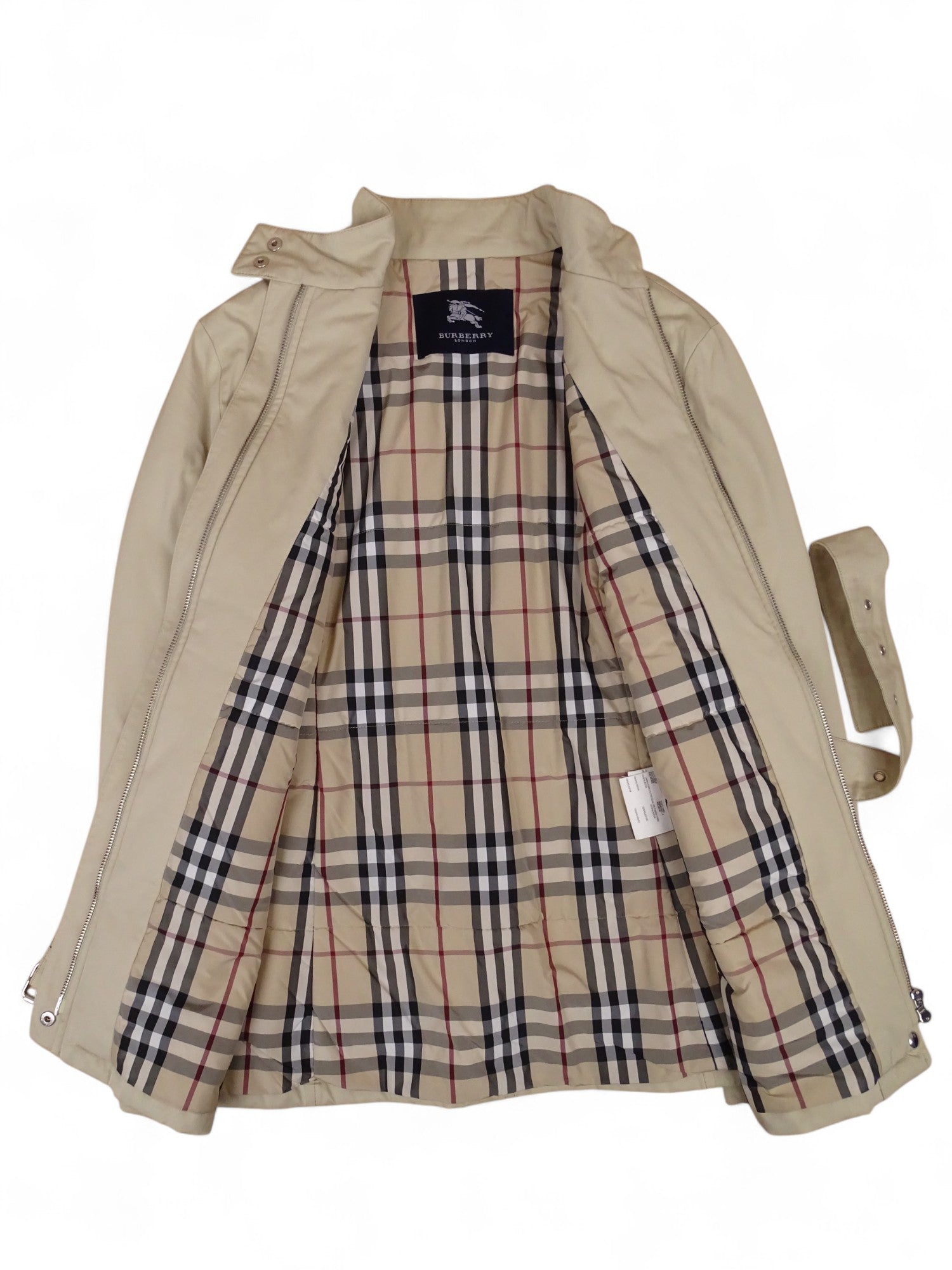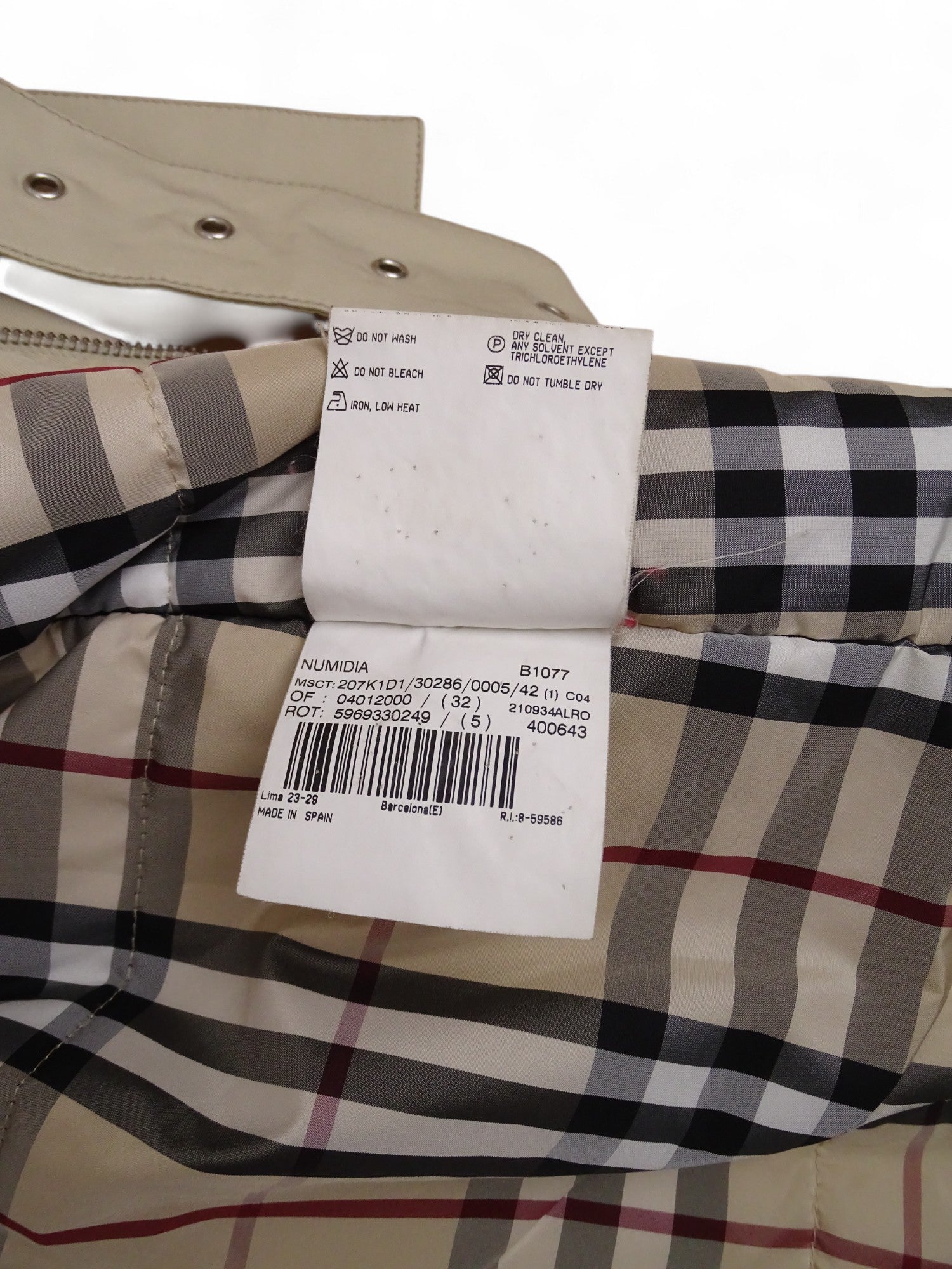 Size 42 correspond à un M femme ou un grand S. Trench beige Burberry pour femme. Excellent état général; légères petites marques sur les finitions en cuir (voir photos).