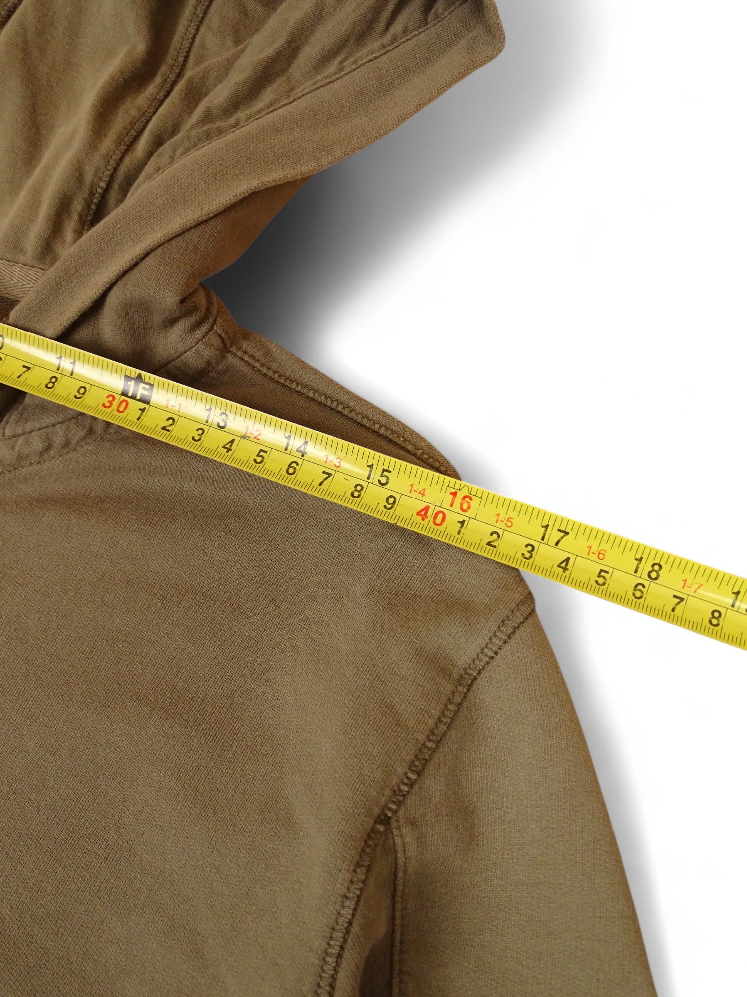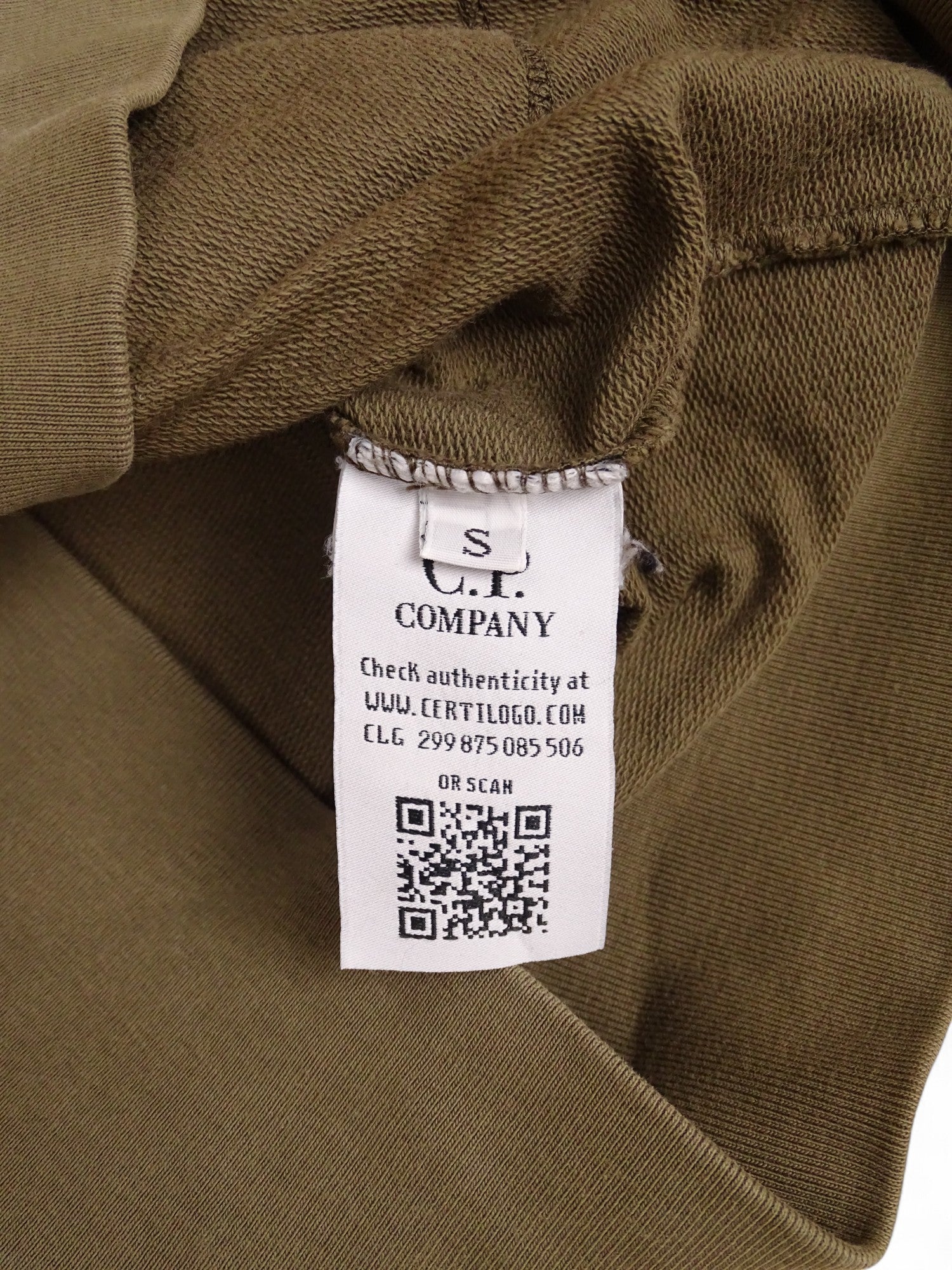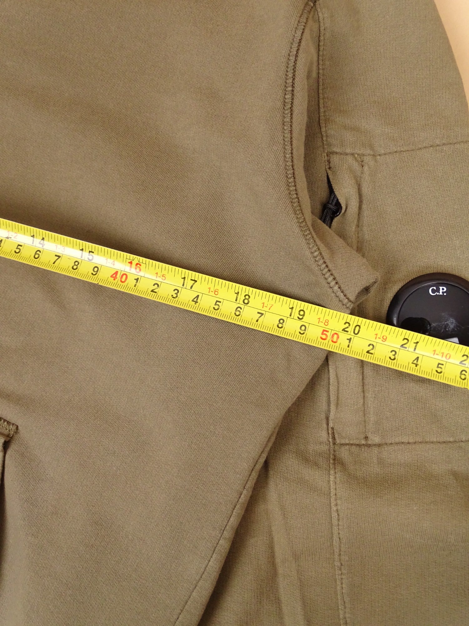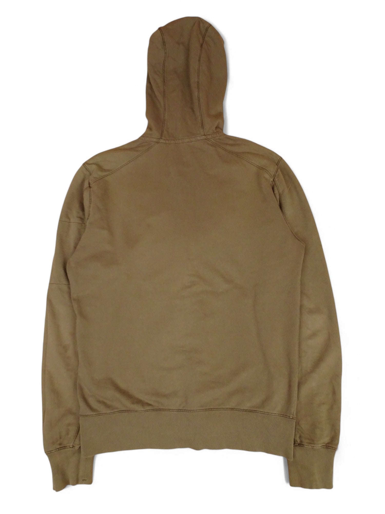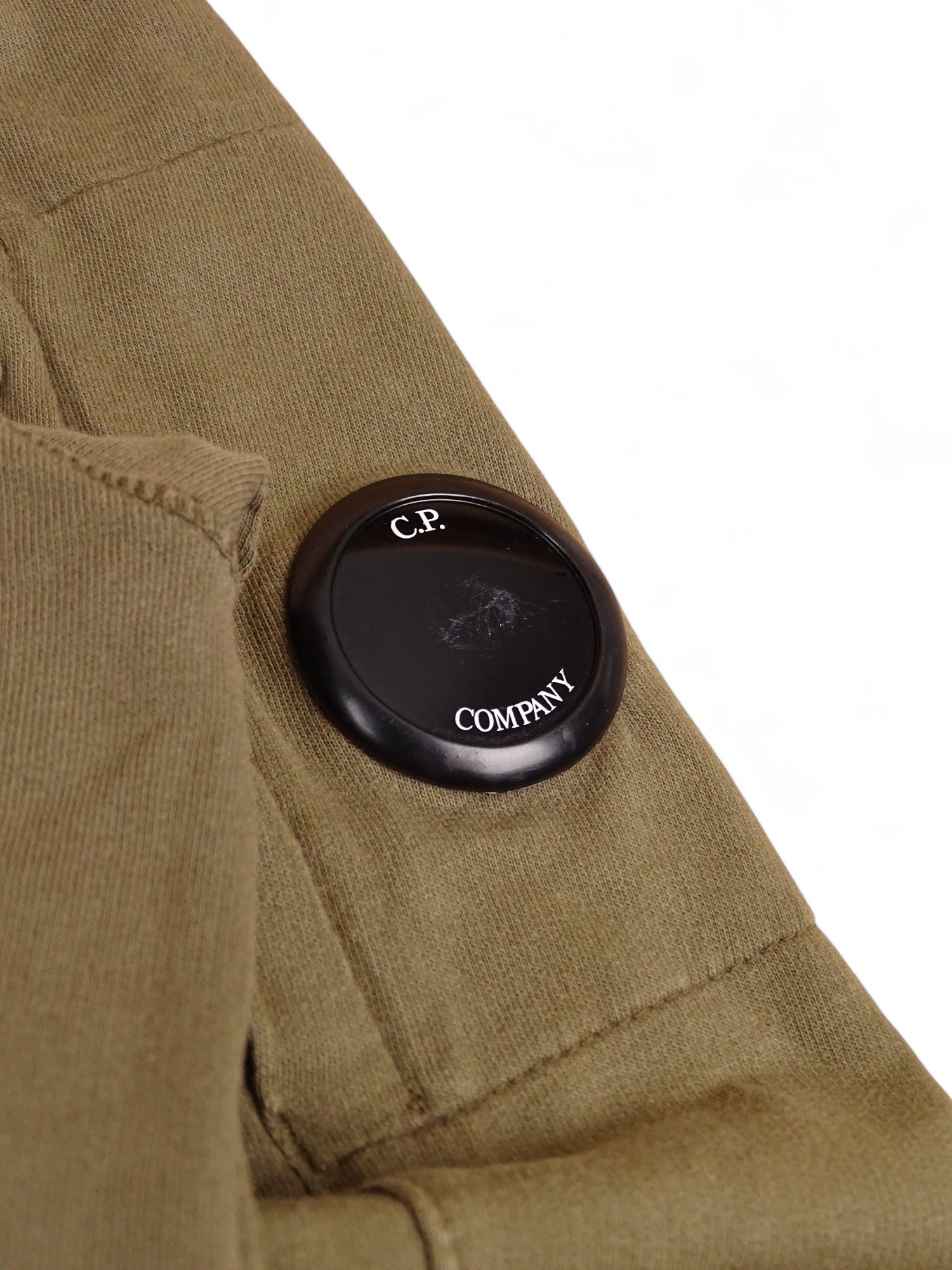 Sweat à capuche zippé C.P. Company pour homme, coloris kaki, taille S. Très bon état général ; petite tache au niveau du coude et lentille iconique rayée (voir photos). Mesures précises fournies en images.