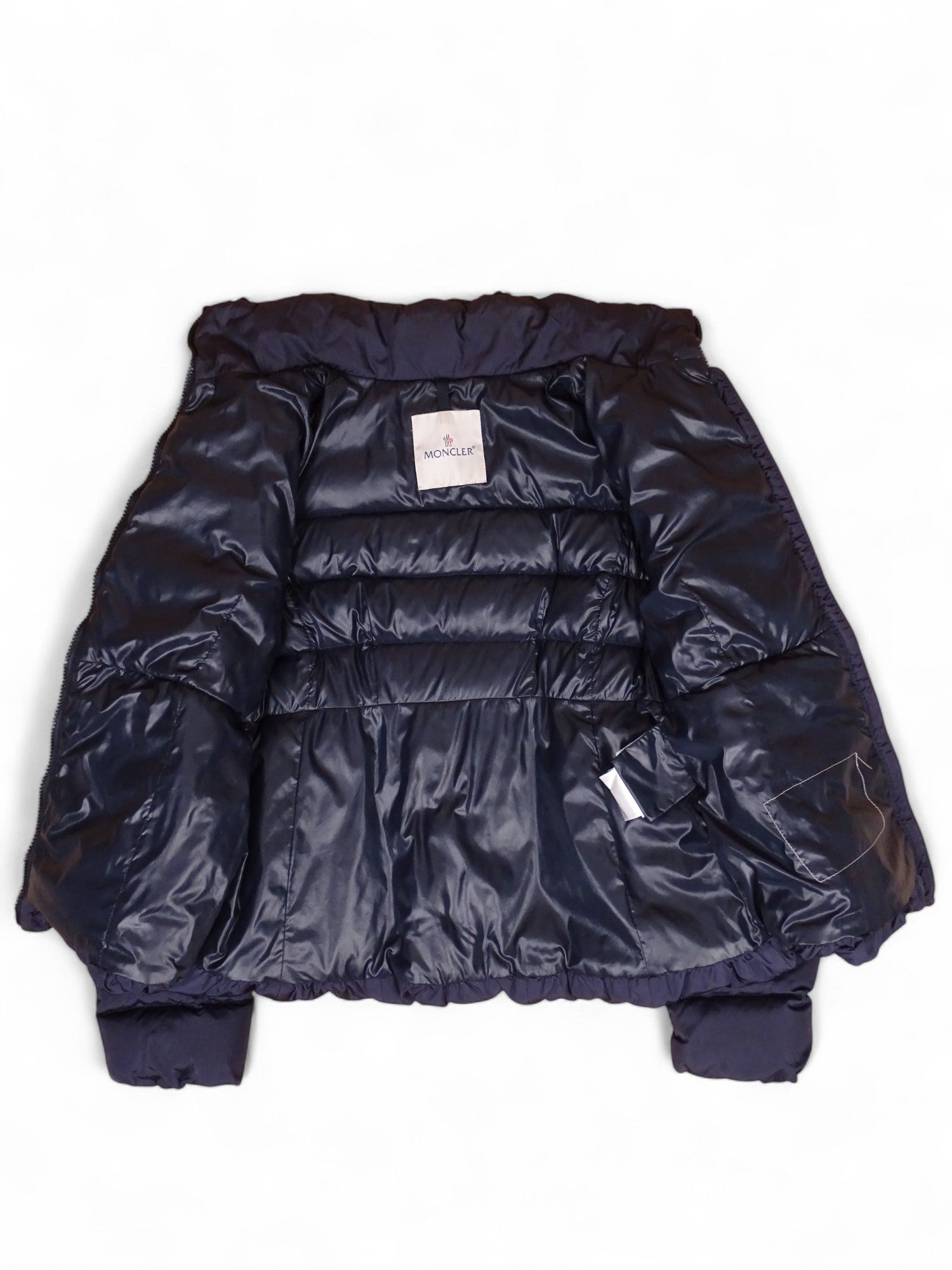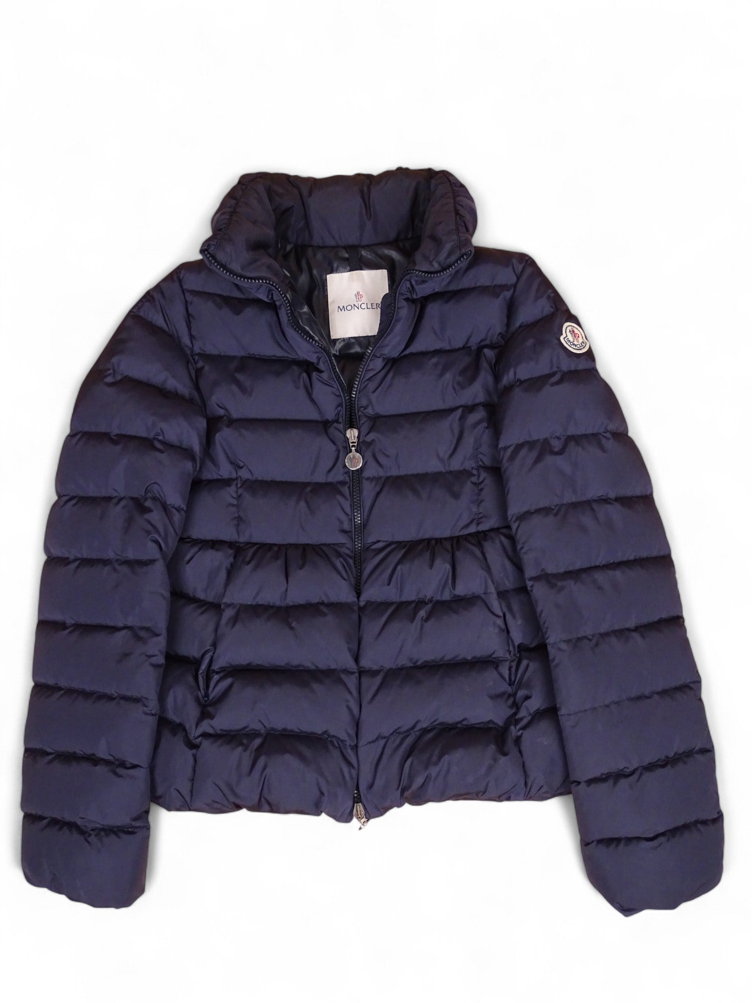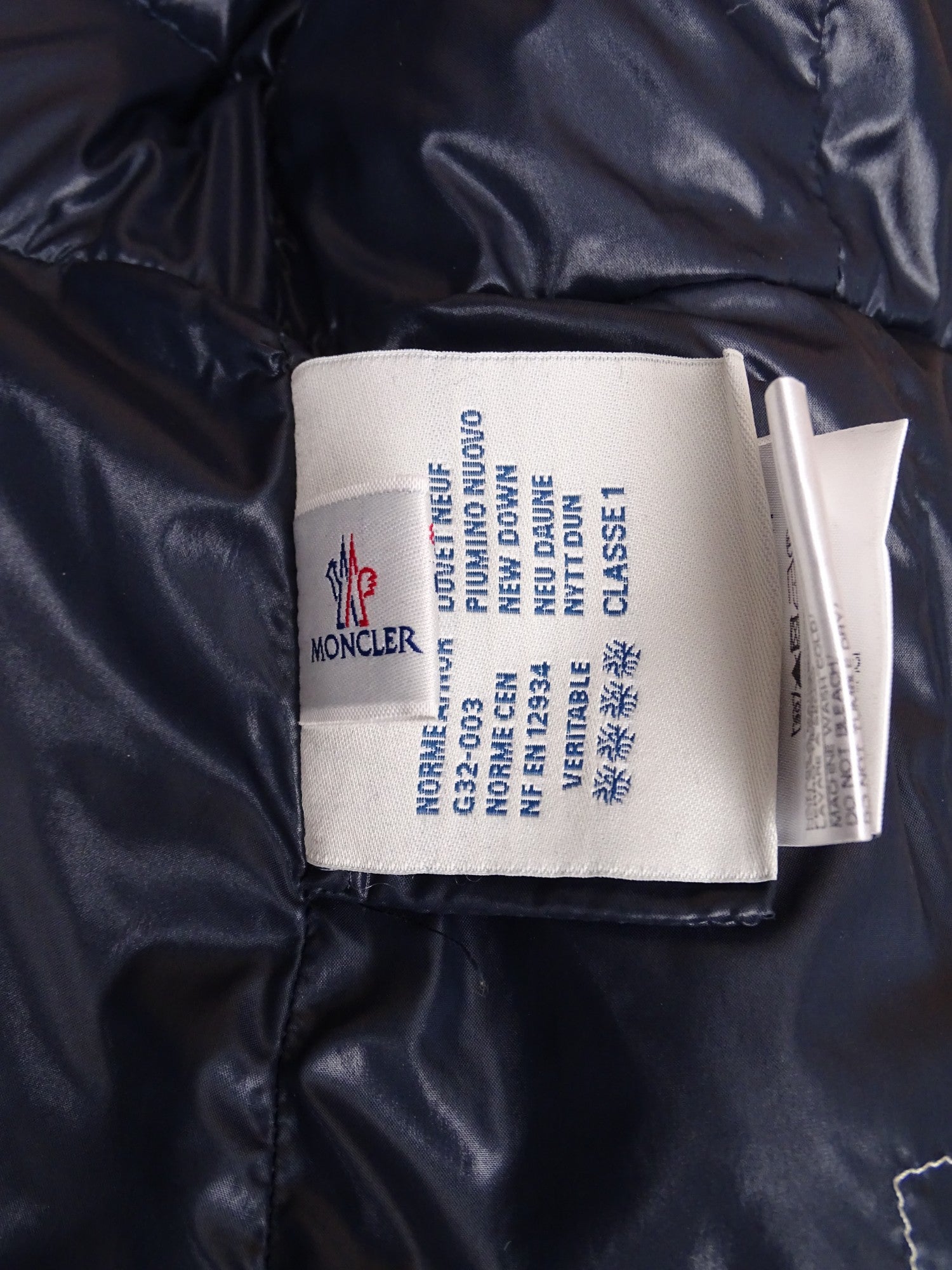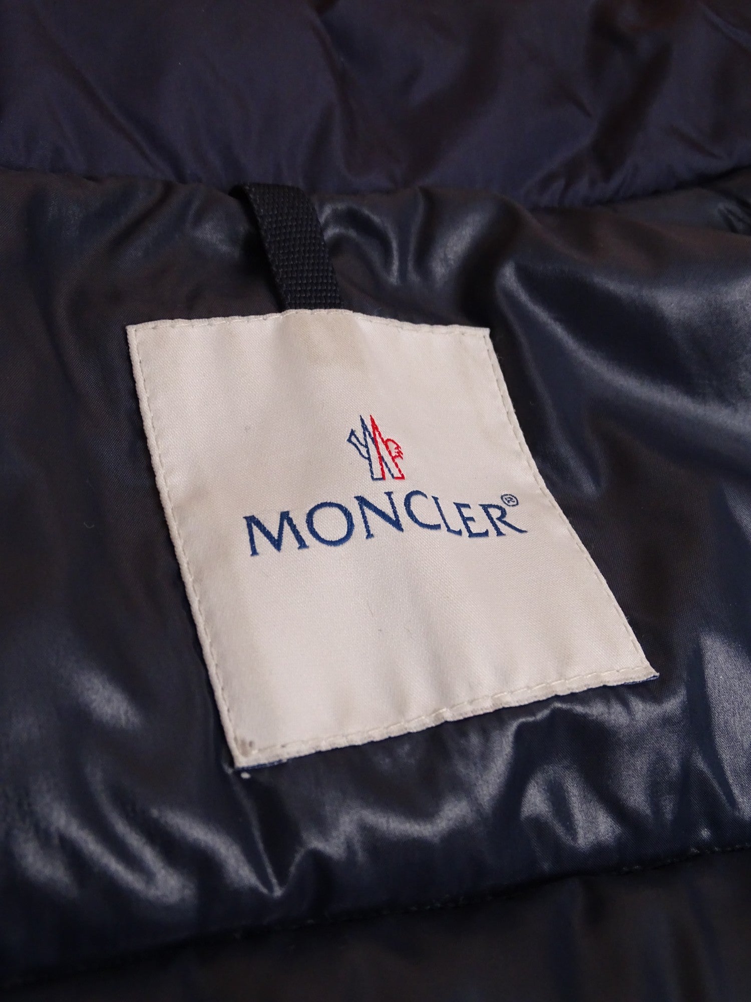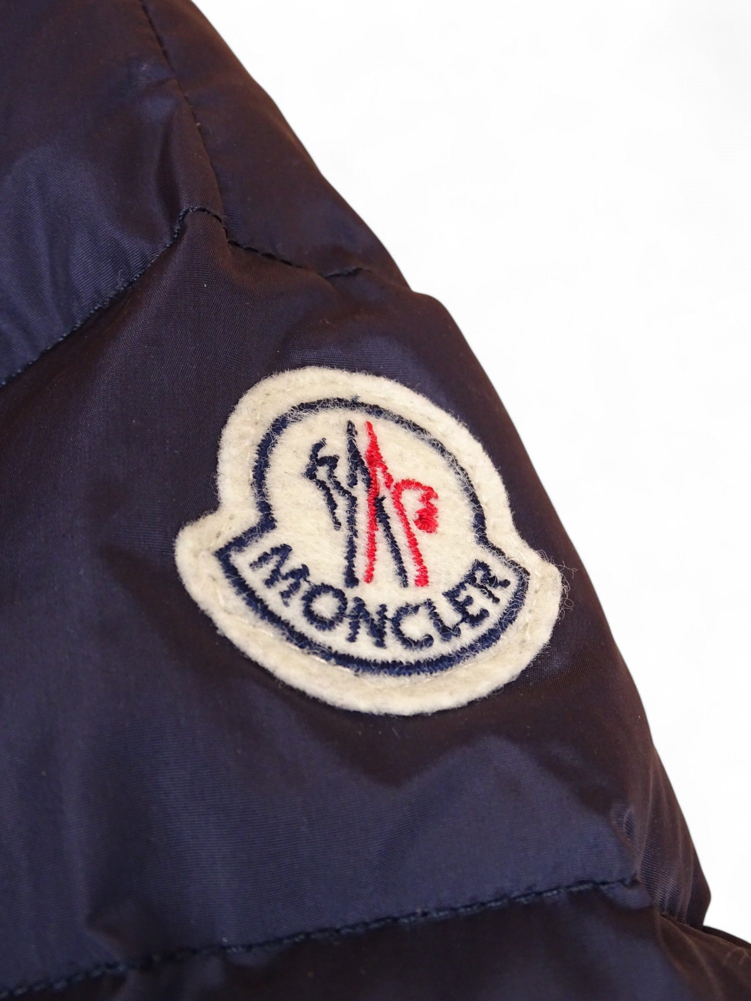 Doudoune Moncler matelassée bleu marine en taille S Femme (étiquette 14 ans). Très bon état, légèrement sale en bas du dos mais facilement nettoyable. Parfait pour une silhouette féminine.