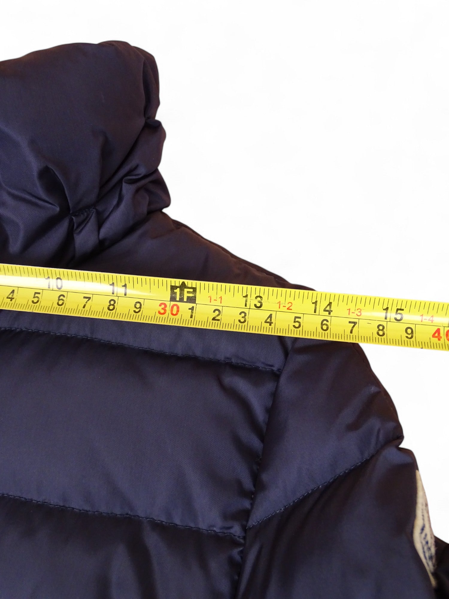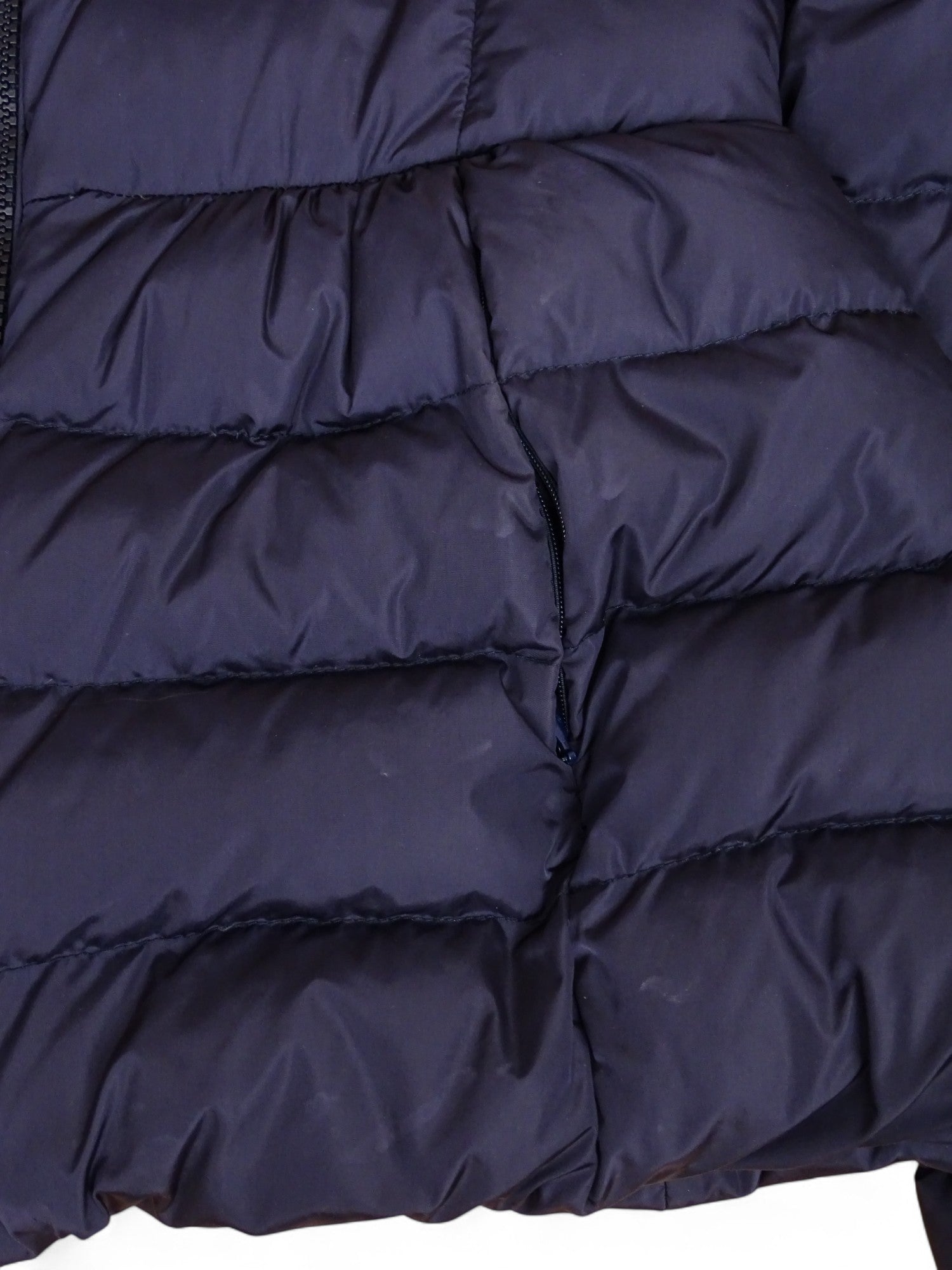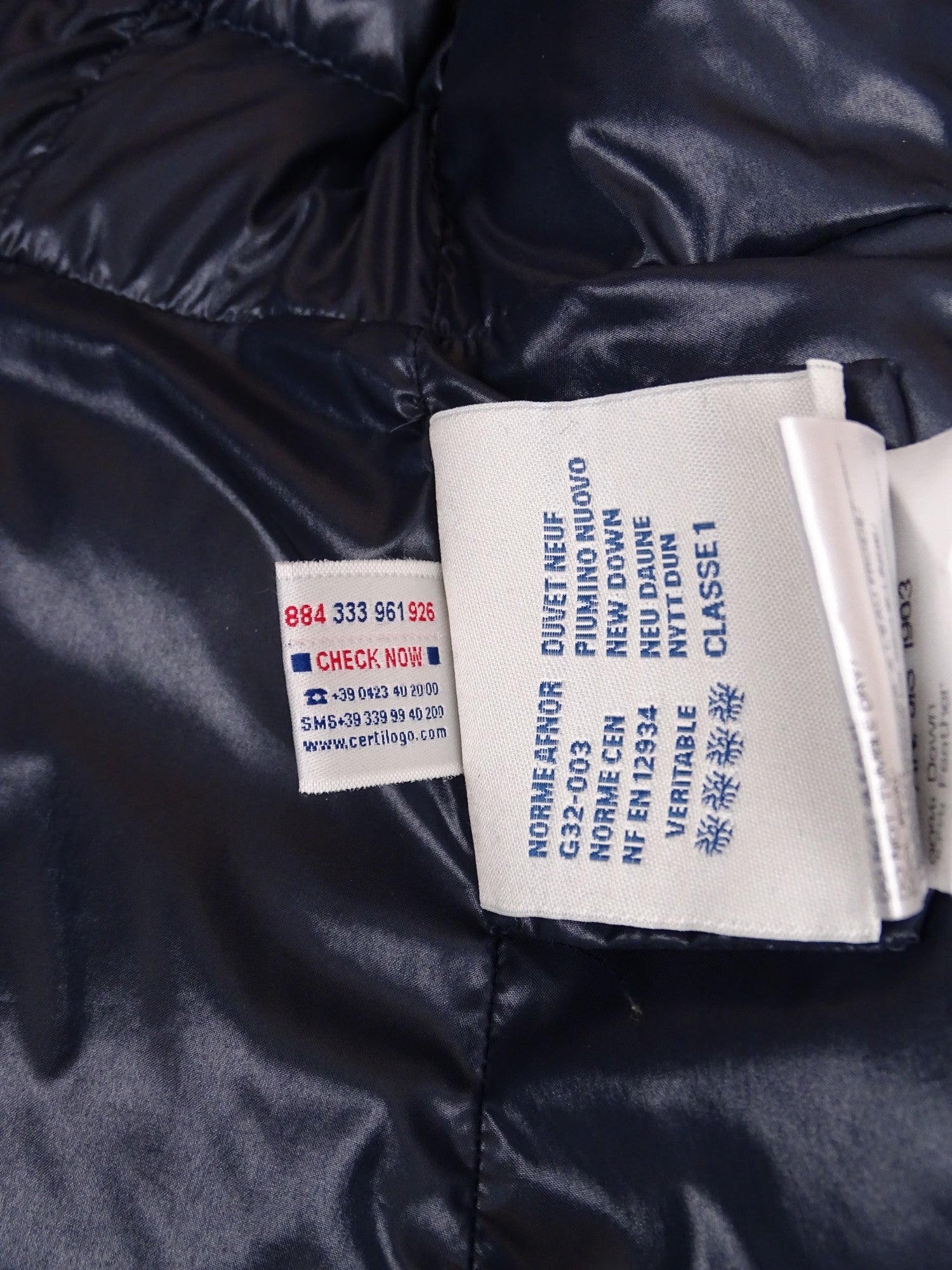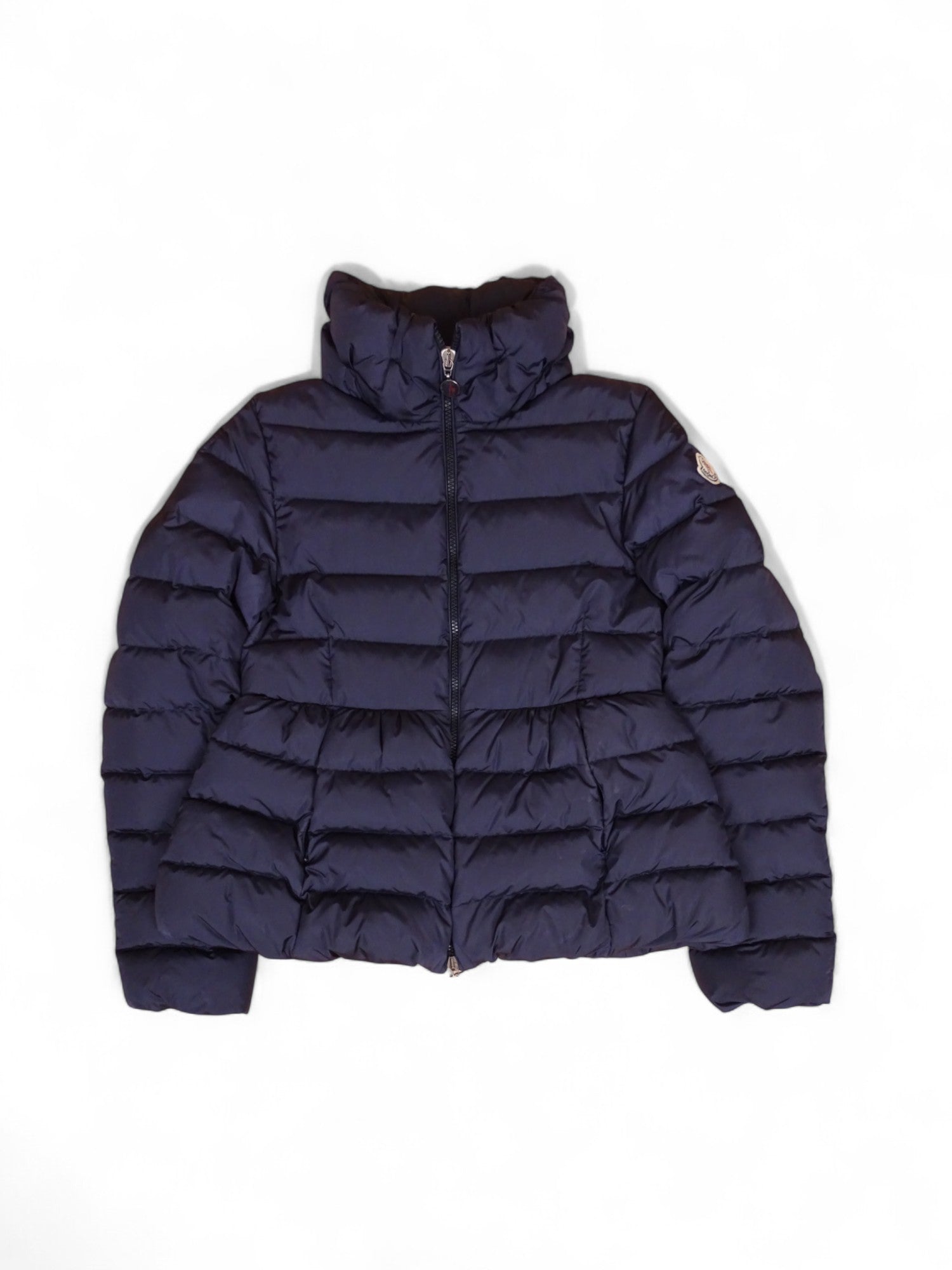 Doudoune Moncler matelassée bleu marine en taille S Femme (étiquette 14 ans). Très bon état, légèrement sale en bas du dos mais facilement nettoyable. Parfait pour une silhouette féminine.