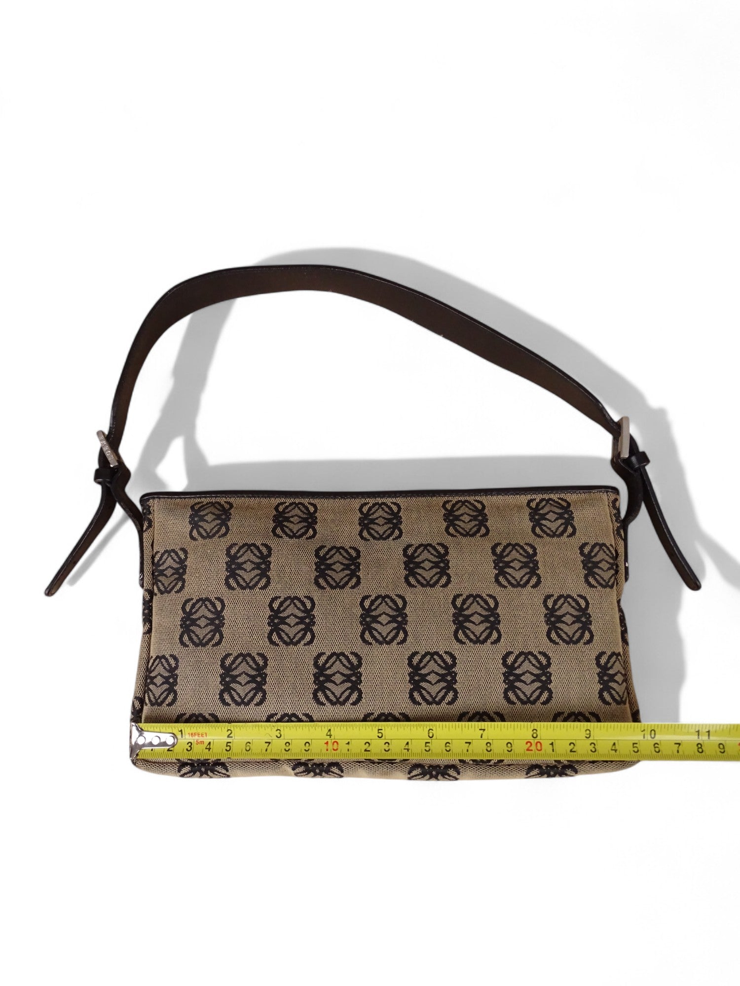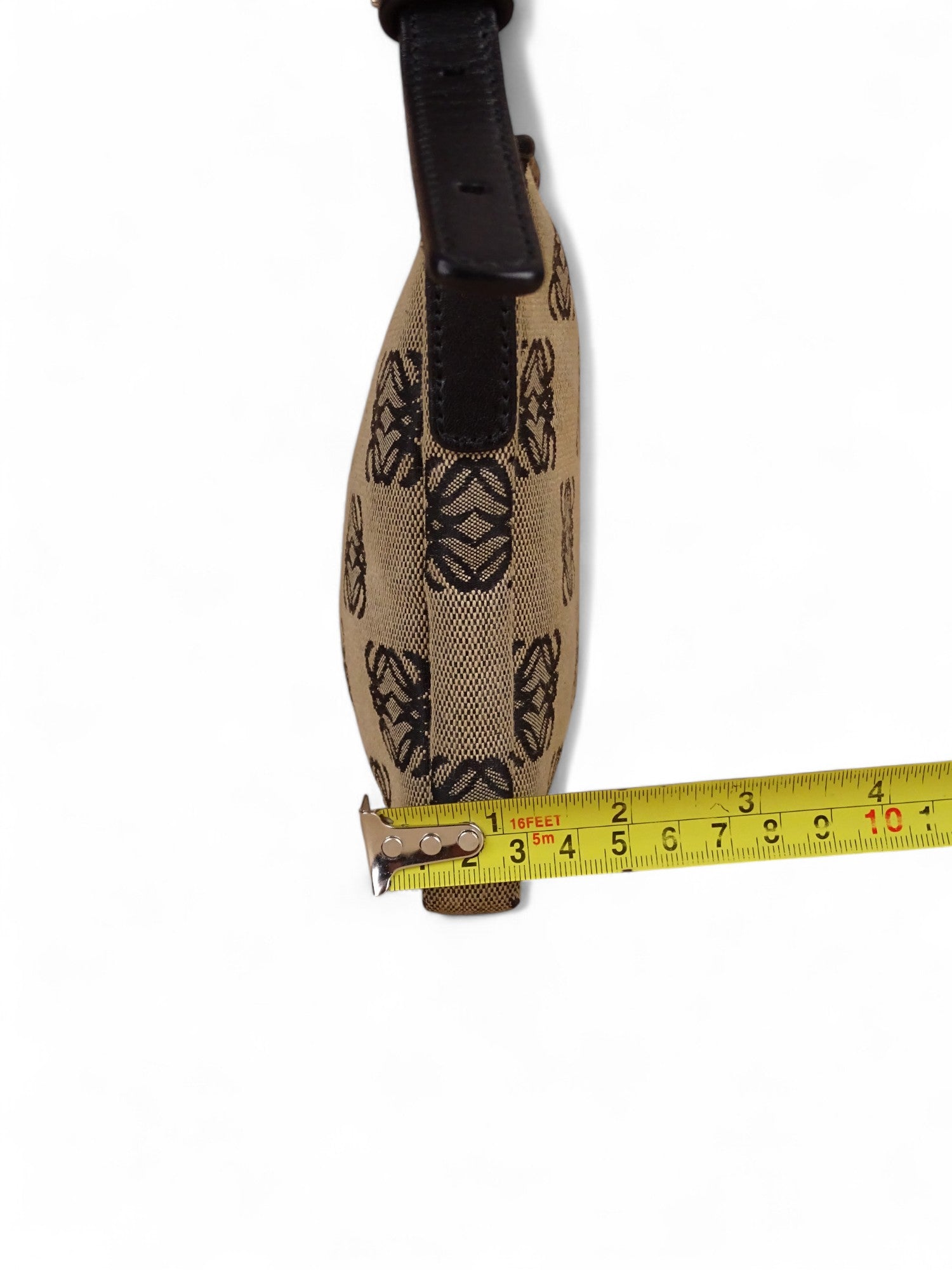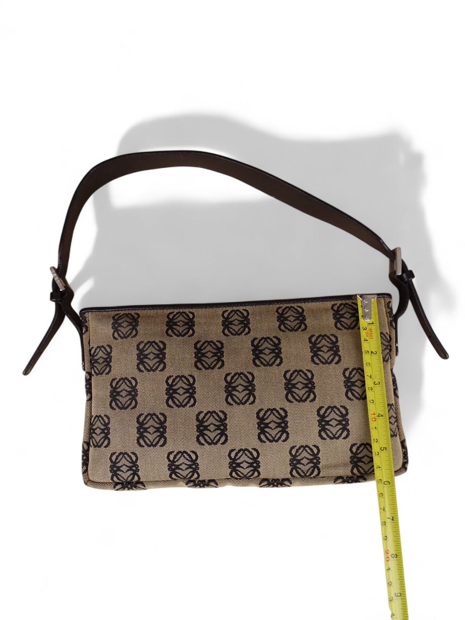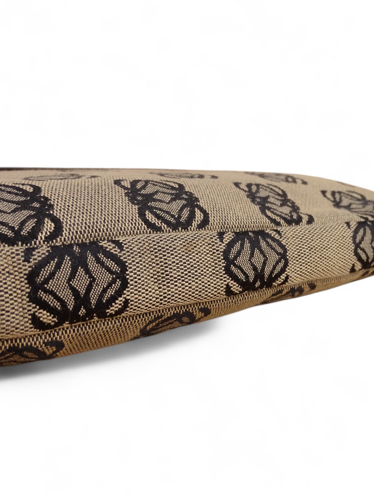 Sac Loewe porté épaule, toile beige et marron avec logo Anagram. Très bon état ; une mini trace dessous et quelques petites marques sur l'anse en cuir (voir photos).