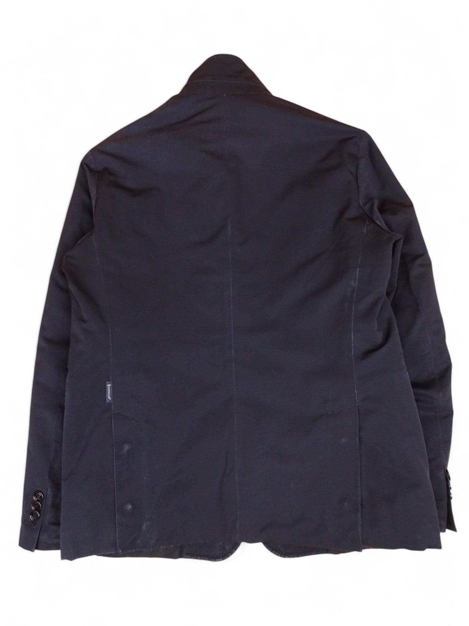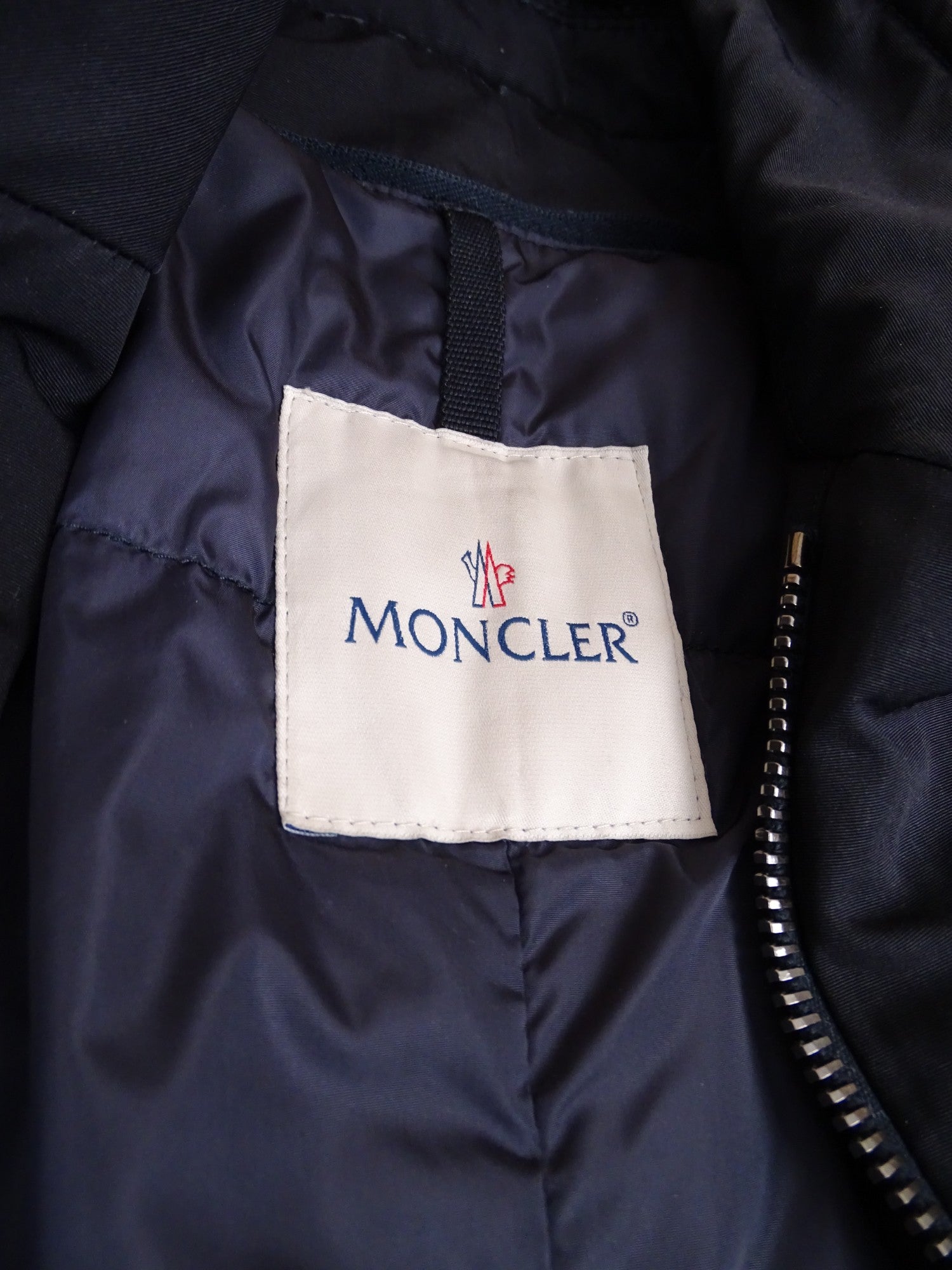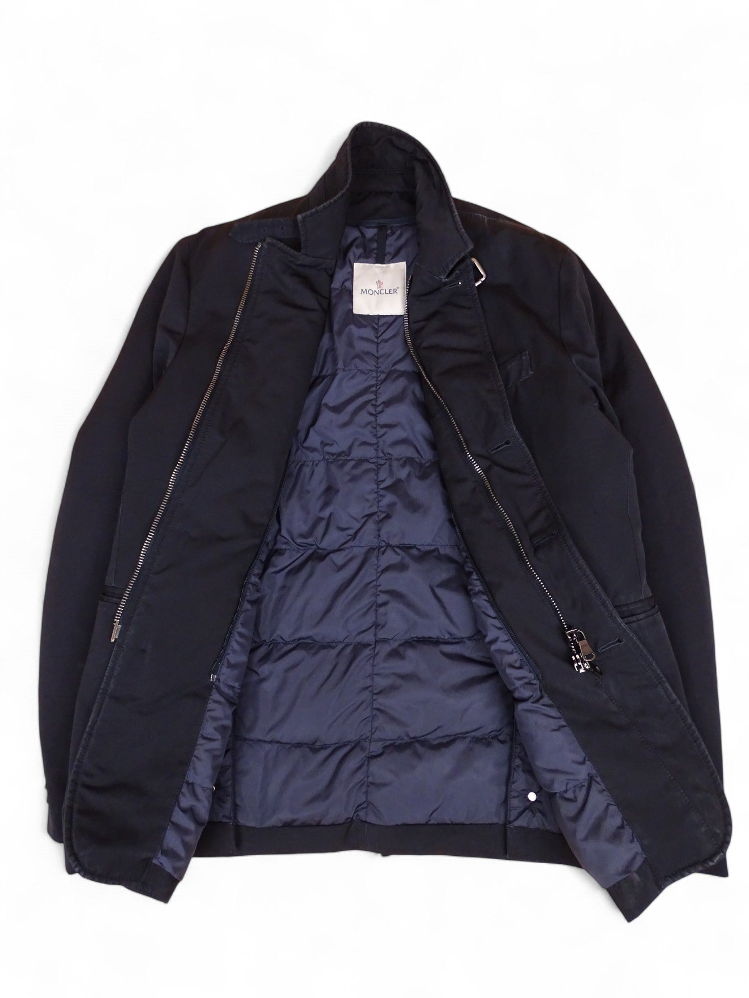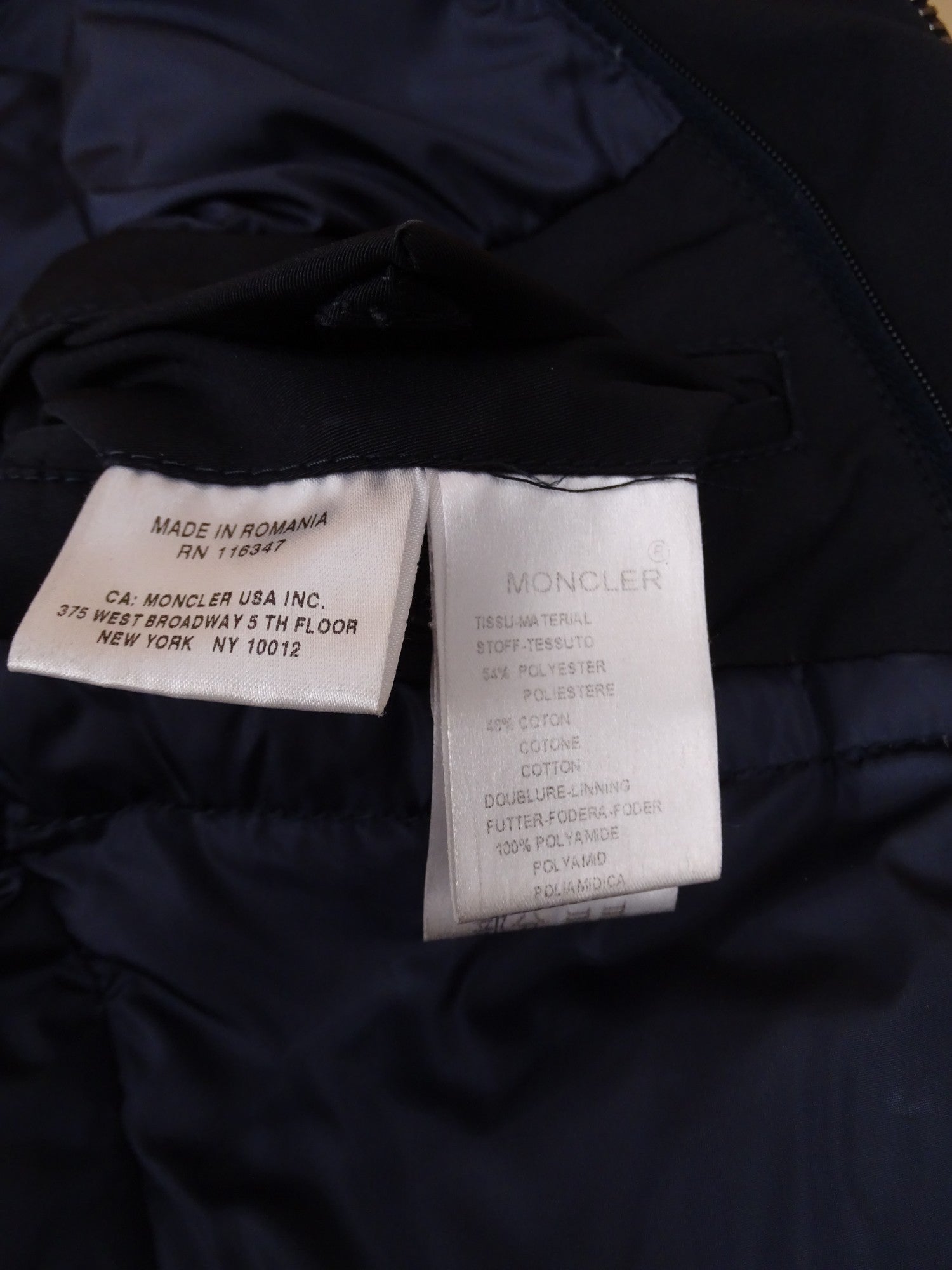 Manteau Moncler marine matelassé, modèle Claude, en taille XL Homme (taille 4 Moncler). Bon état général. Présente des traces de délavage aux poches et extrémités des manches.