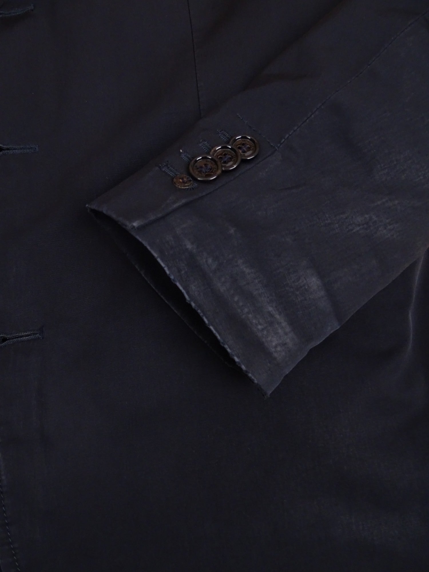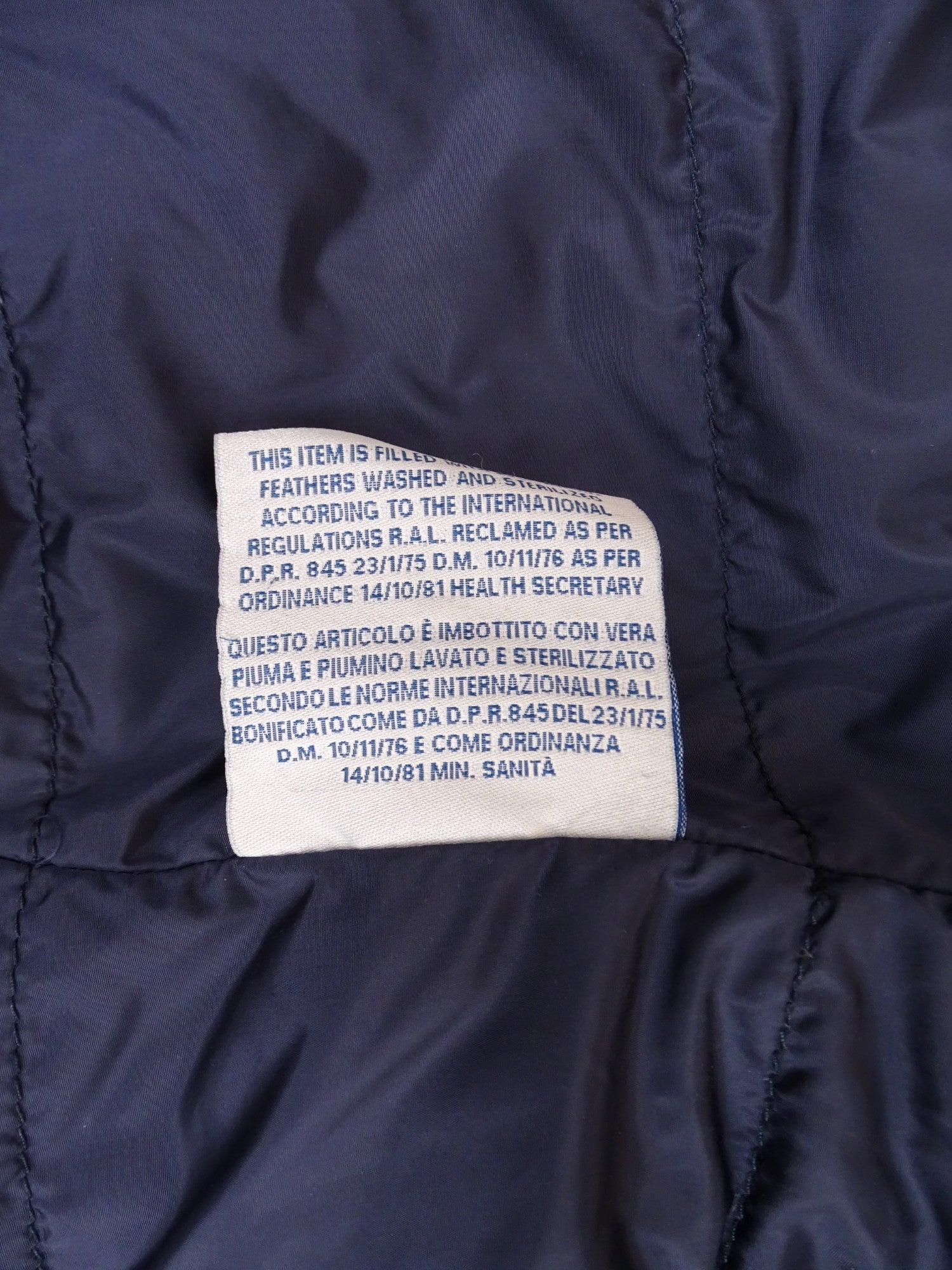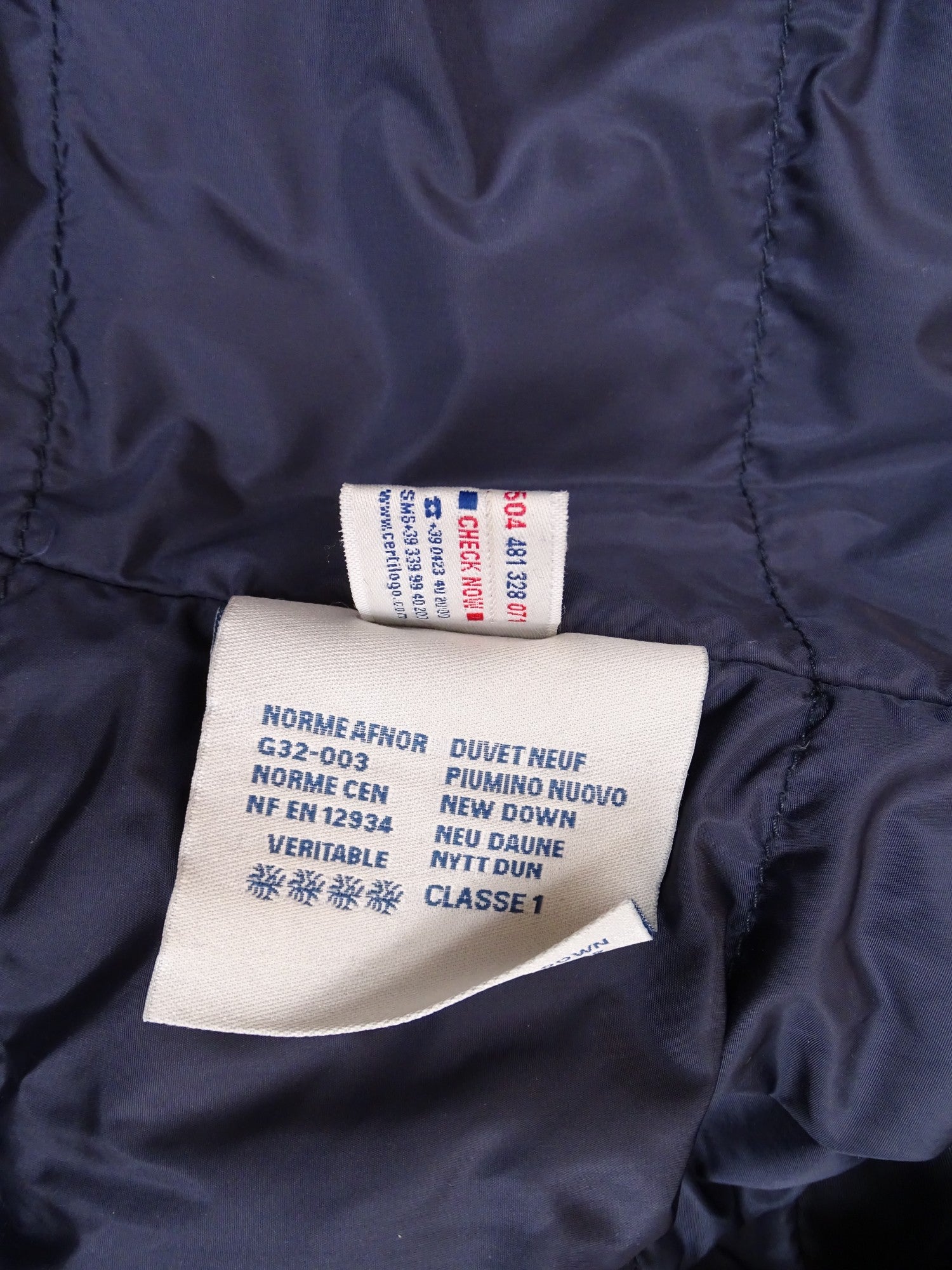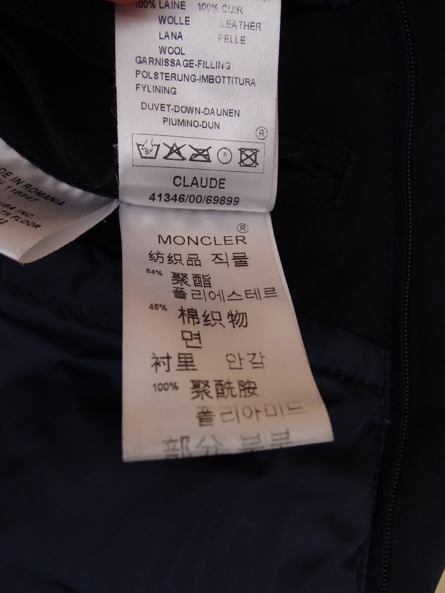 Manteau Moncler marine matelassé, modèle Claude, en taille XL Homme (taille 4 Moncler). Bon état général. Présente des traces de délavage aux poches et extrémités des manches.