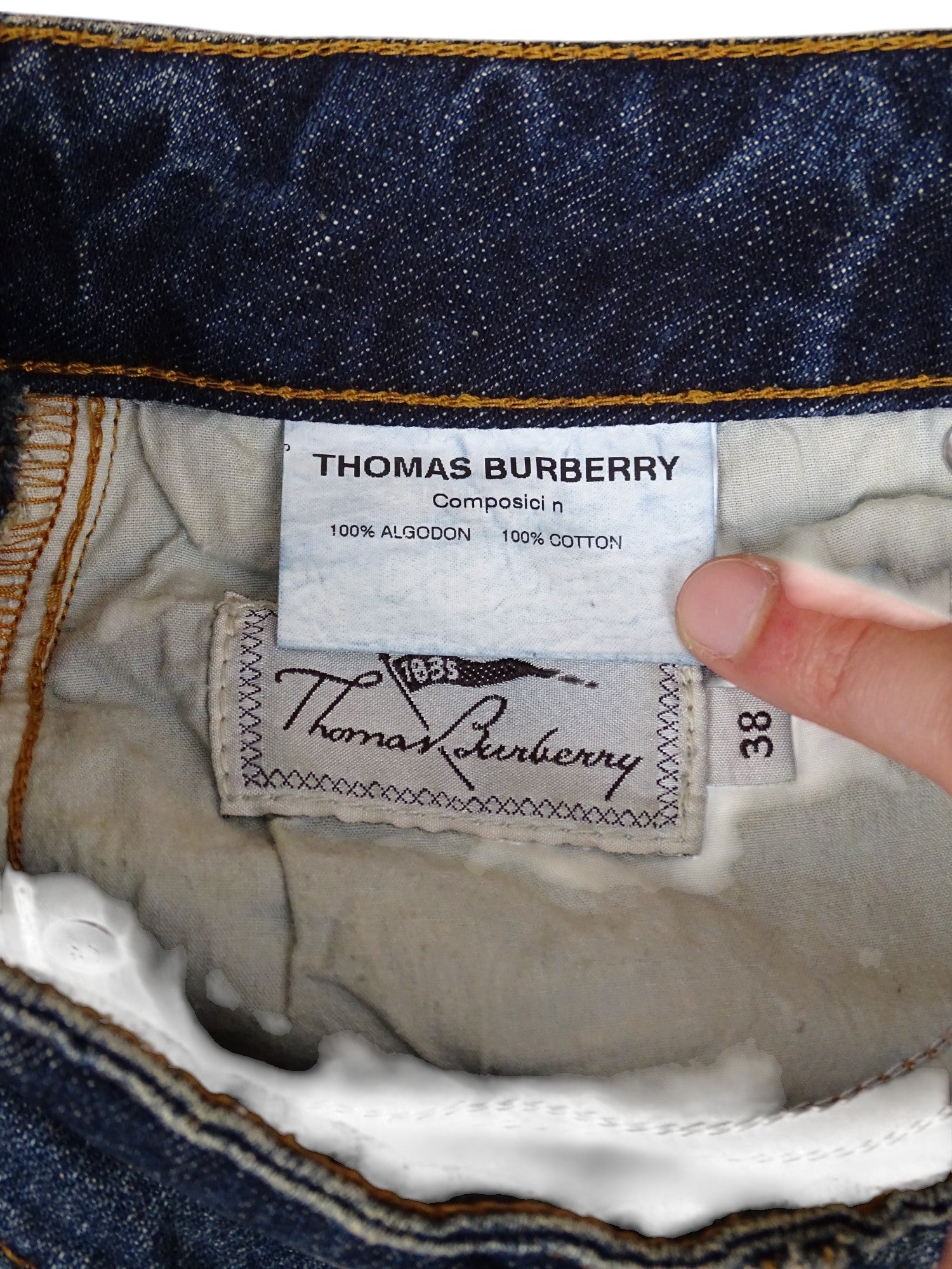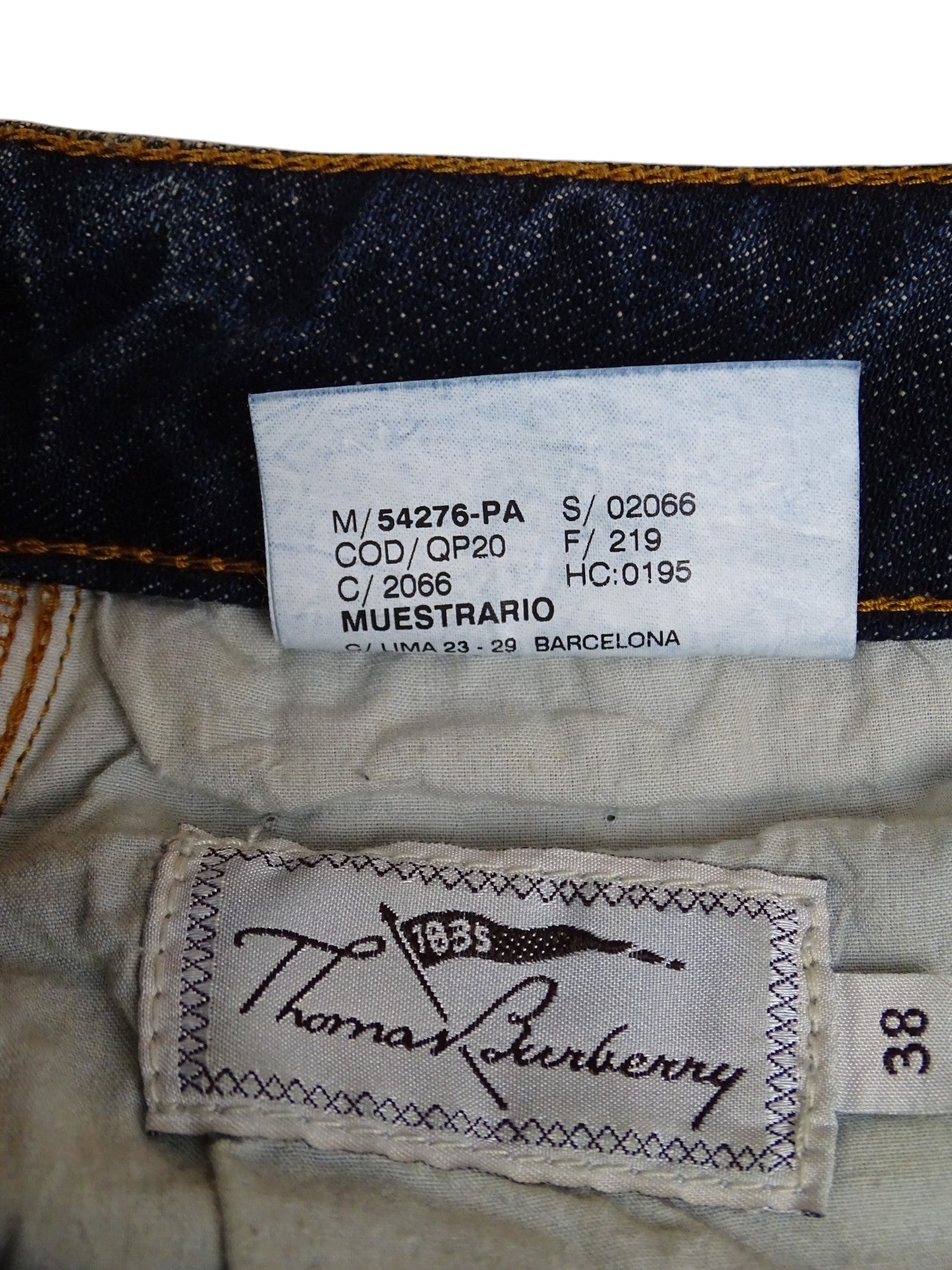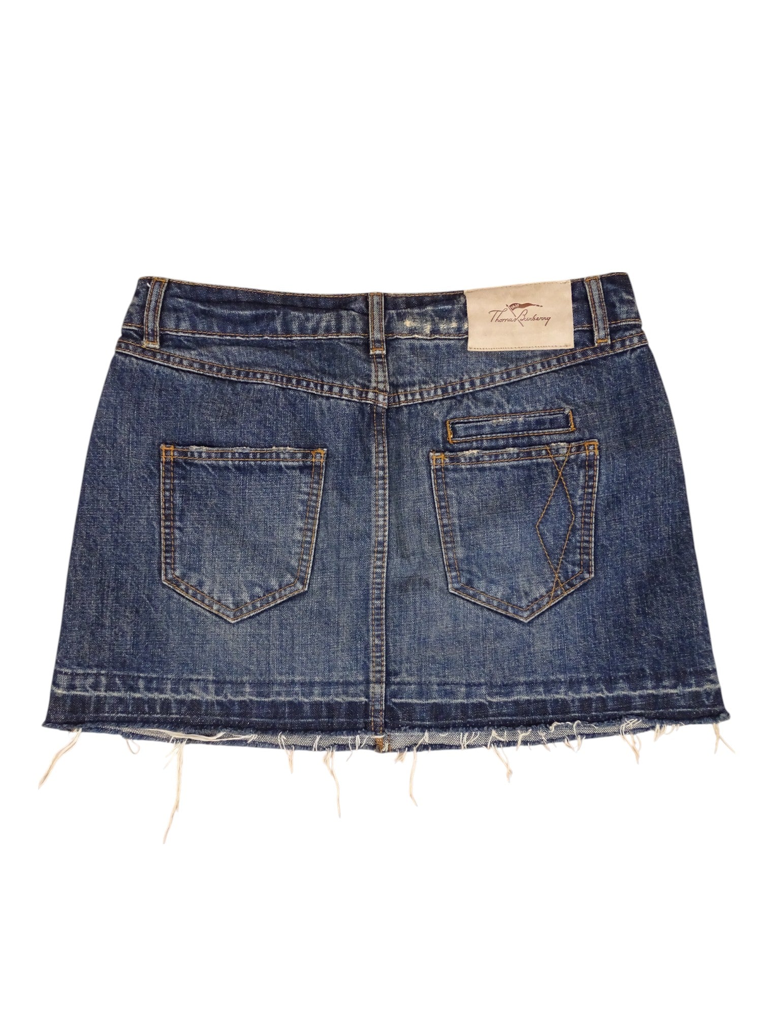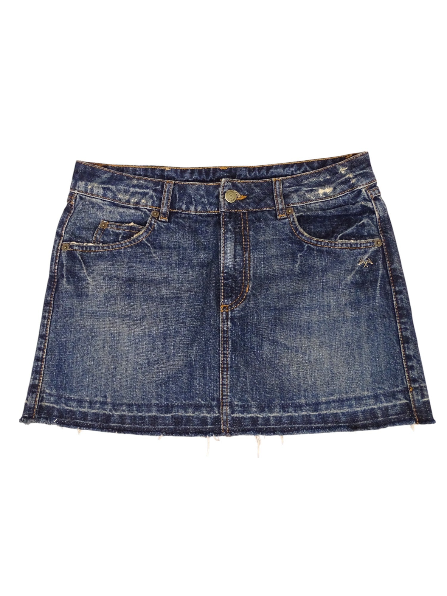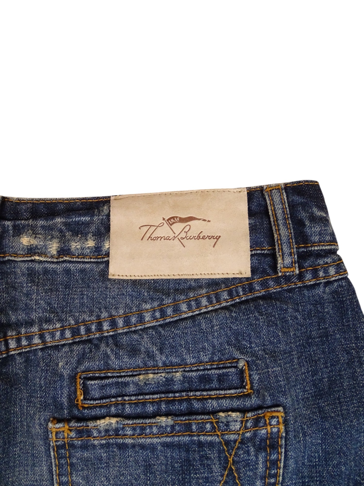Mini-jupe Burberry en jean bleu, taille M femme. Coupe courte avec effet usé volontaire, détails effilochés sur les bords. Très bon état général.
