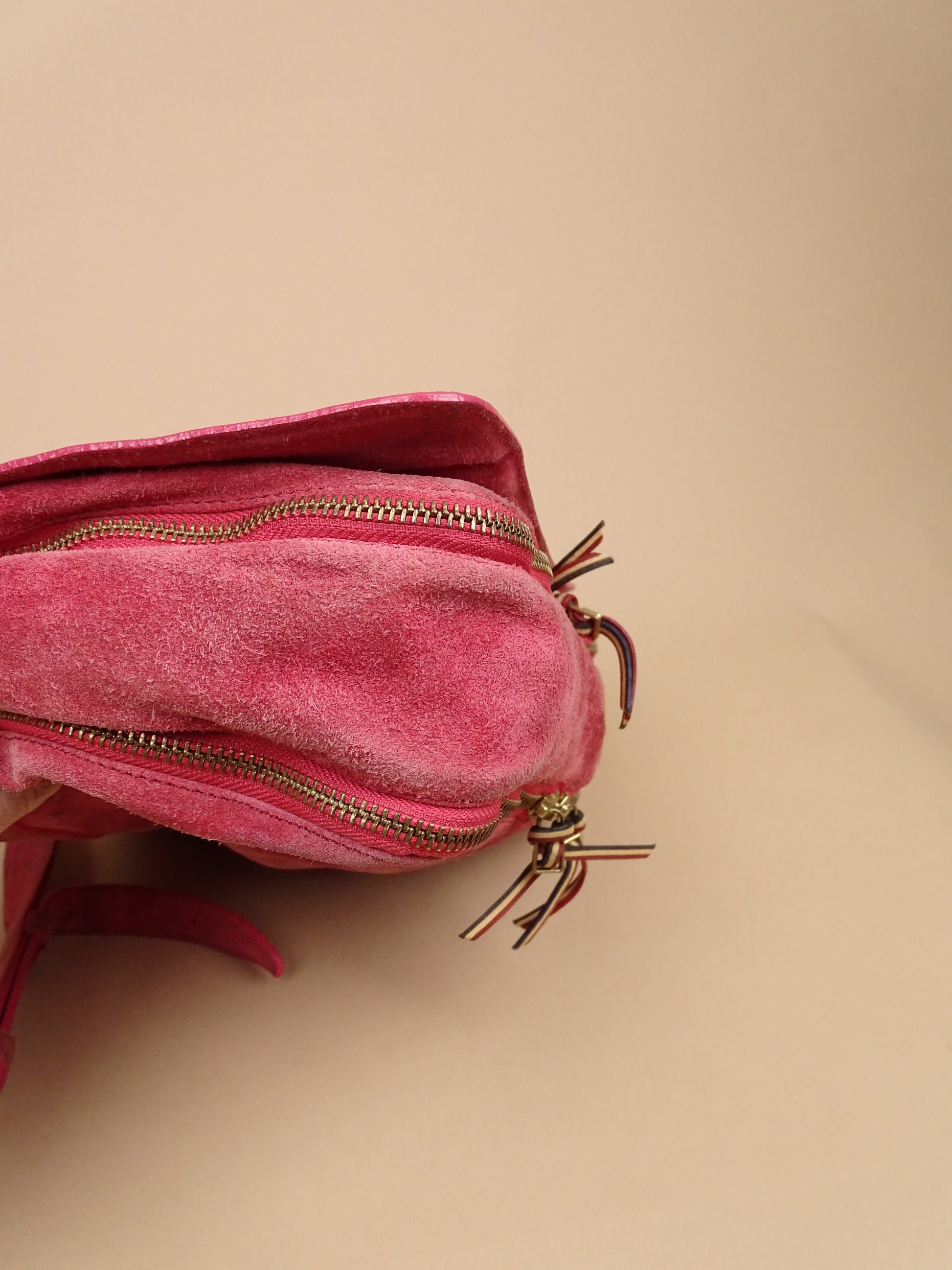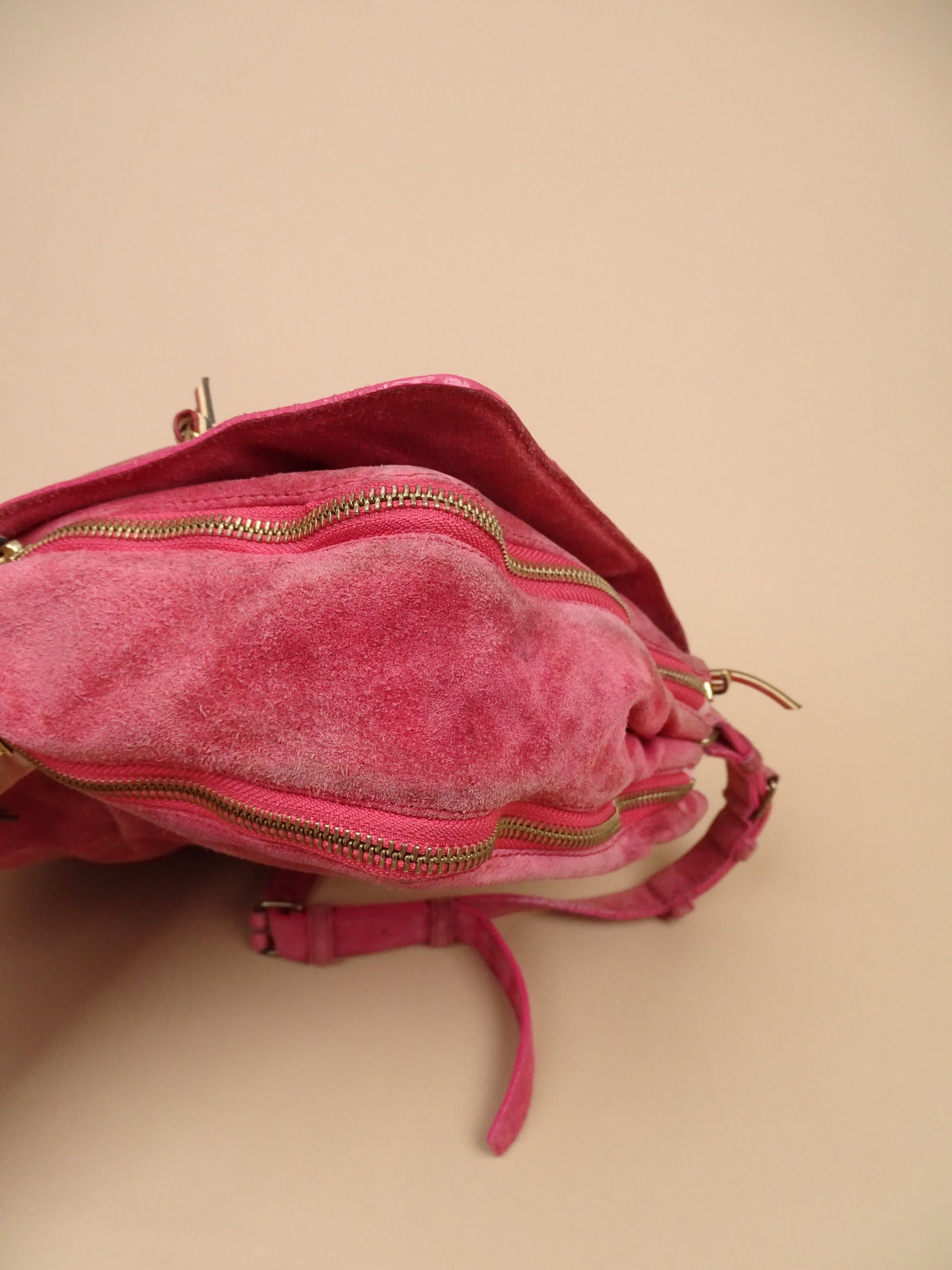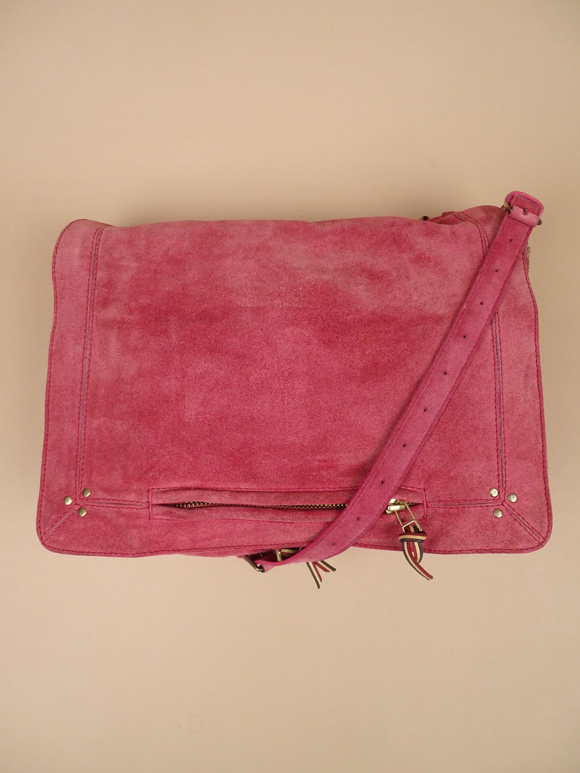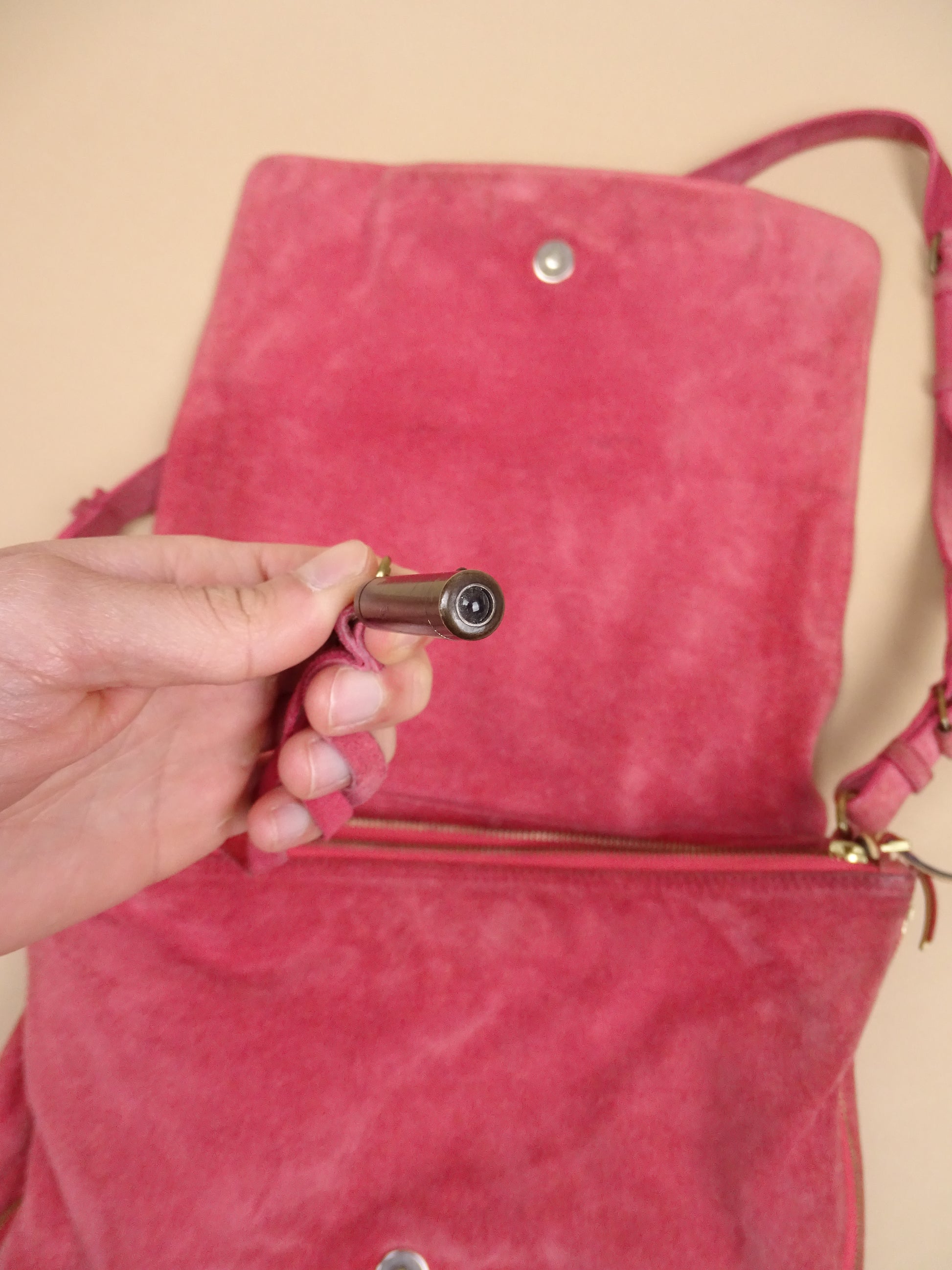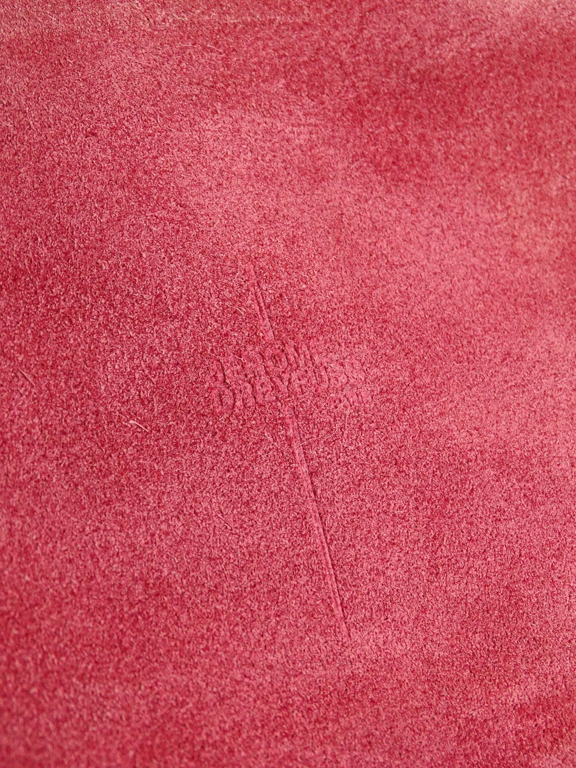 Sac Jérôme Dreyfuss modèle Albert, pour femmes, en daim rose. Le sac est en bon état général, mais présente des signes d’usure visibles : le daim est un peu usé, notamment à l’arrière, la lampe intégrée n’a plus de pile, et un petit trou est présent à l’avant.