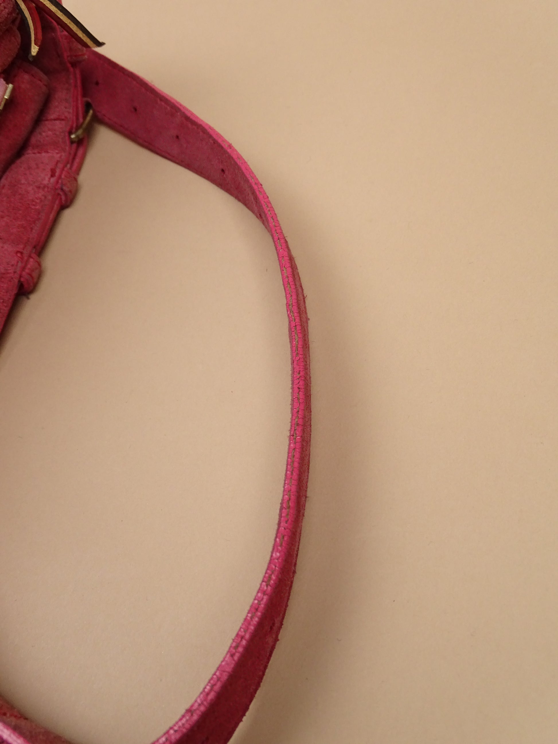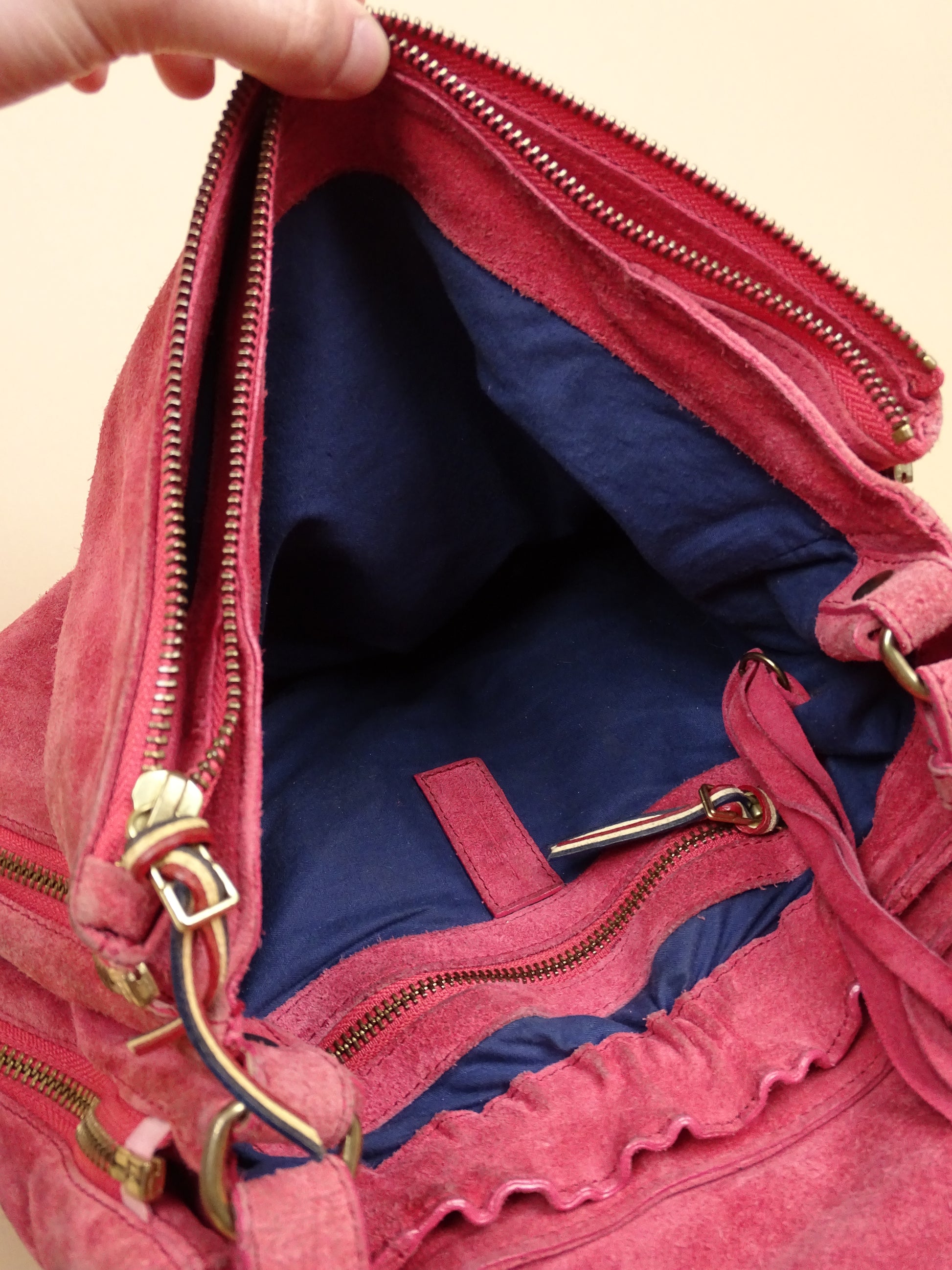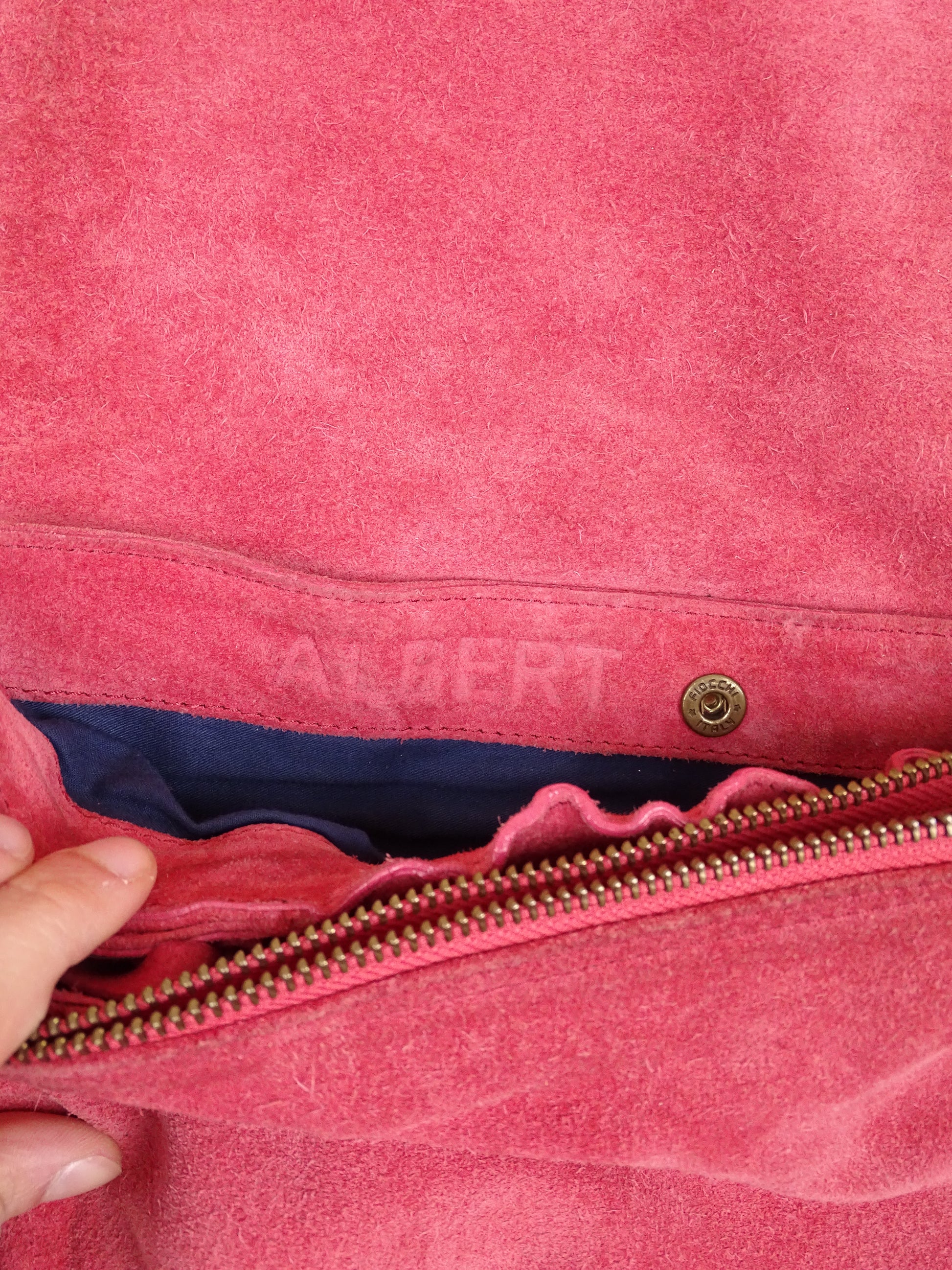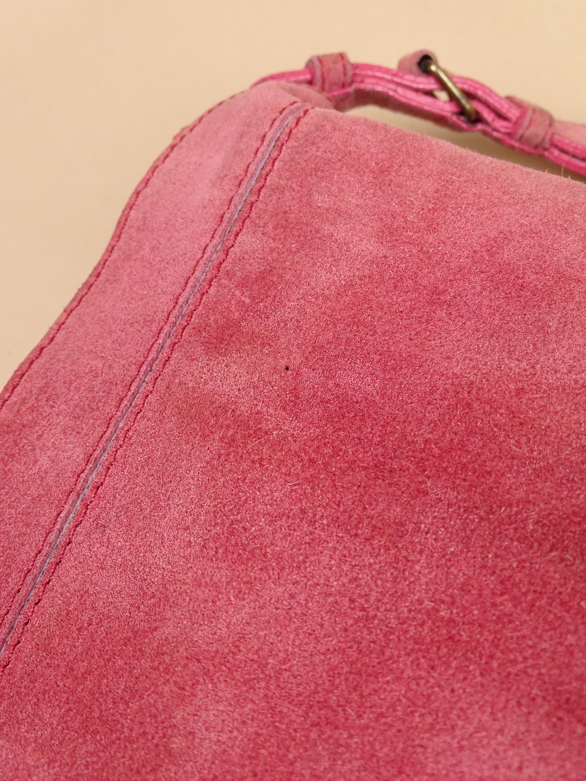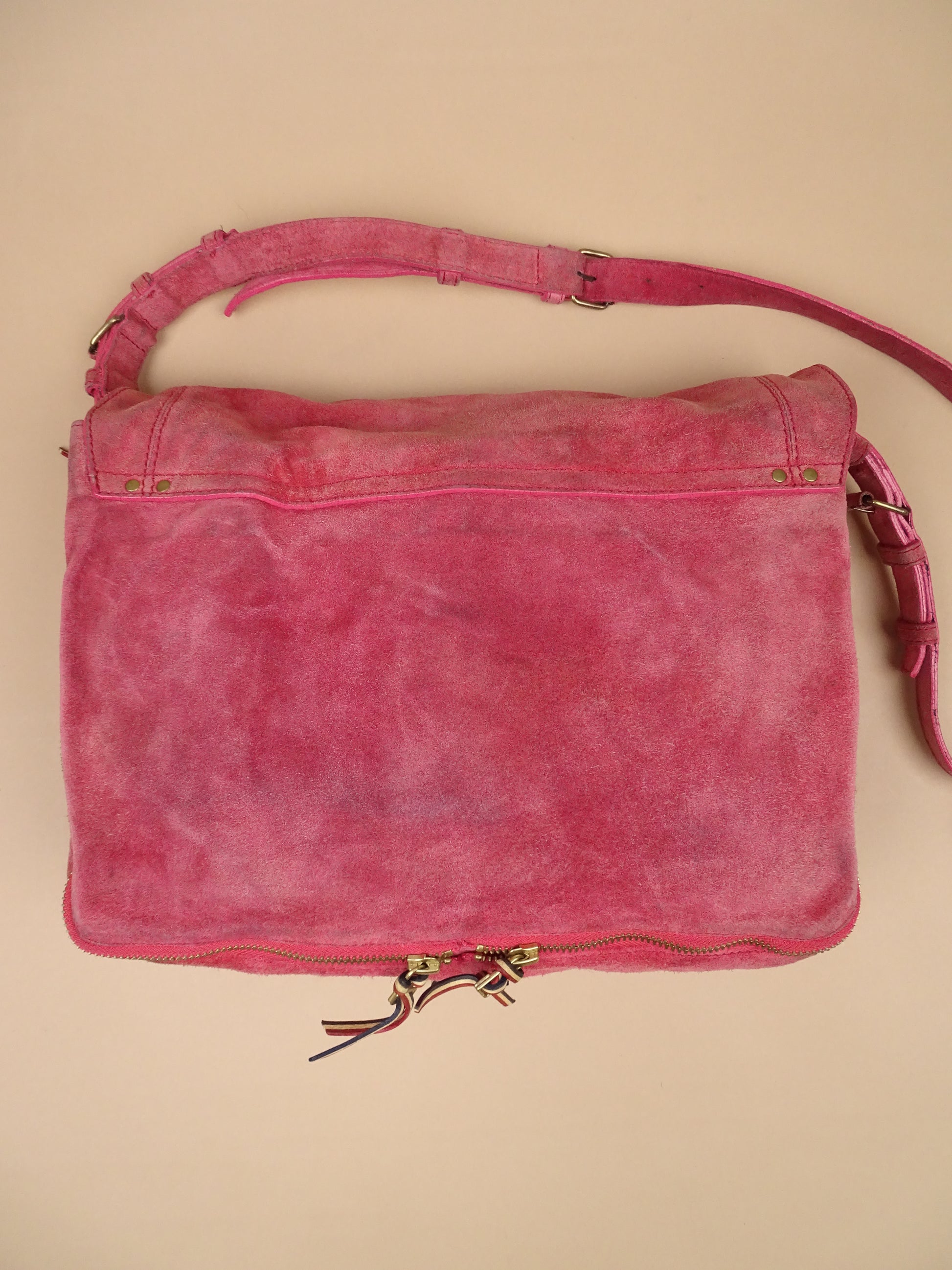 Sac Jérôme Dreyfuss modèle Albert, pour femmes, en daim rose. Le sac est en bon état général, mais présente des signes d’usure visibles : le daim est un peu usé, notamment à l’arrière, la lampe intégrée n’a plus de pile, et un petit trou est présent à l’avant.
