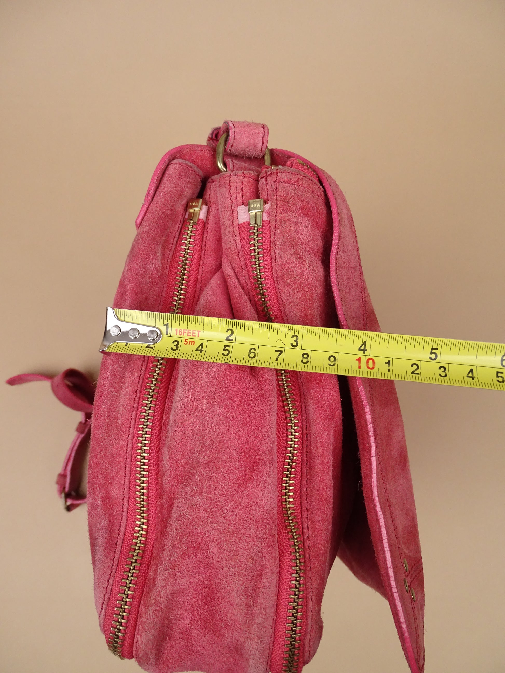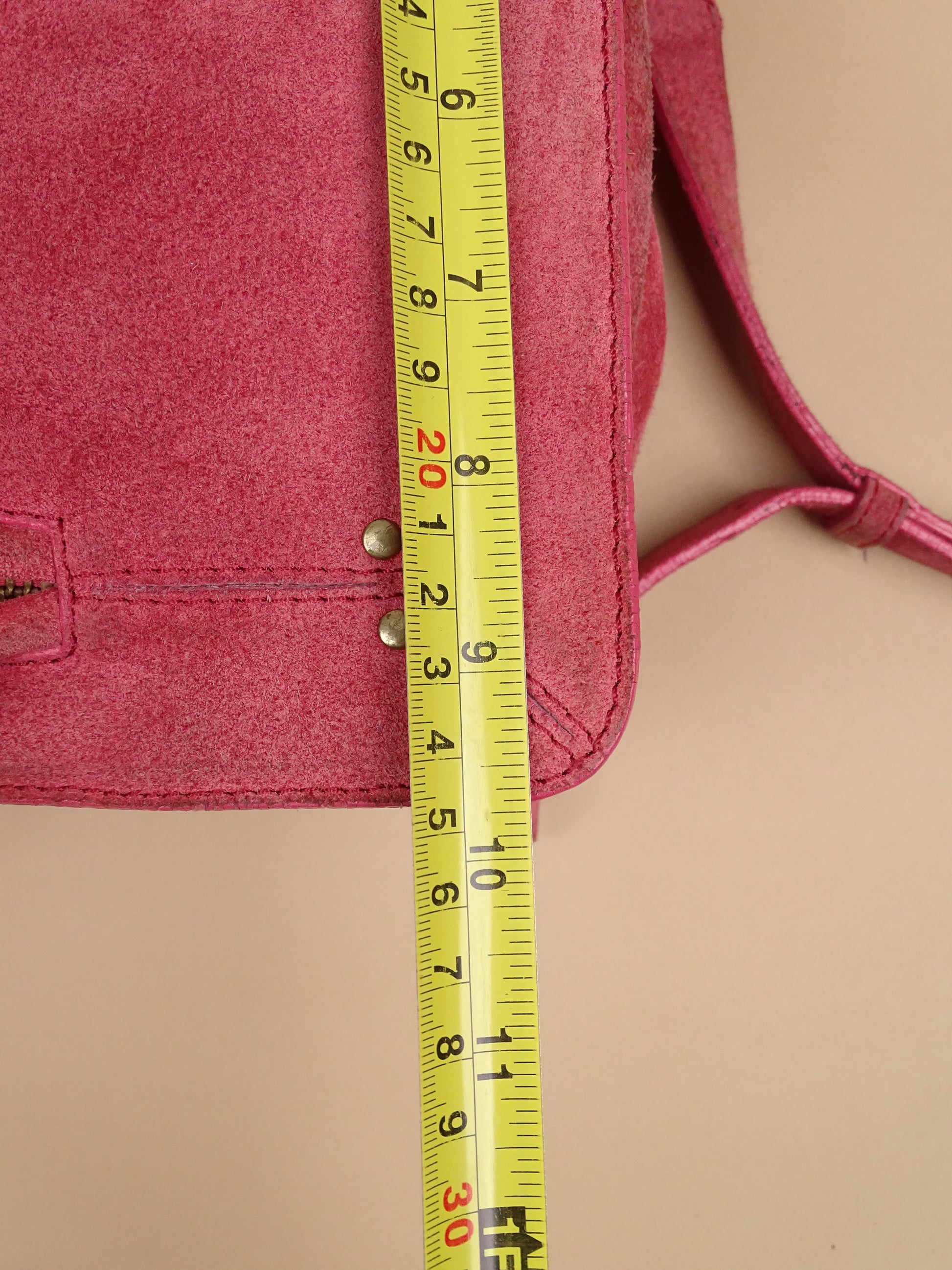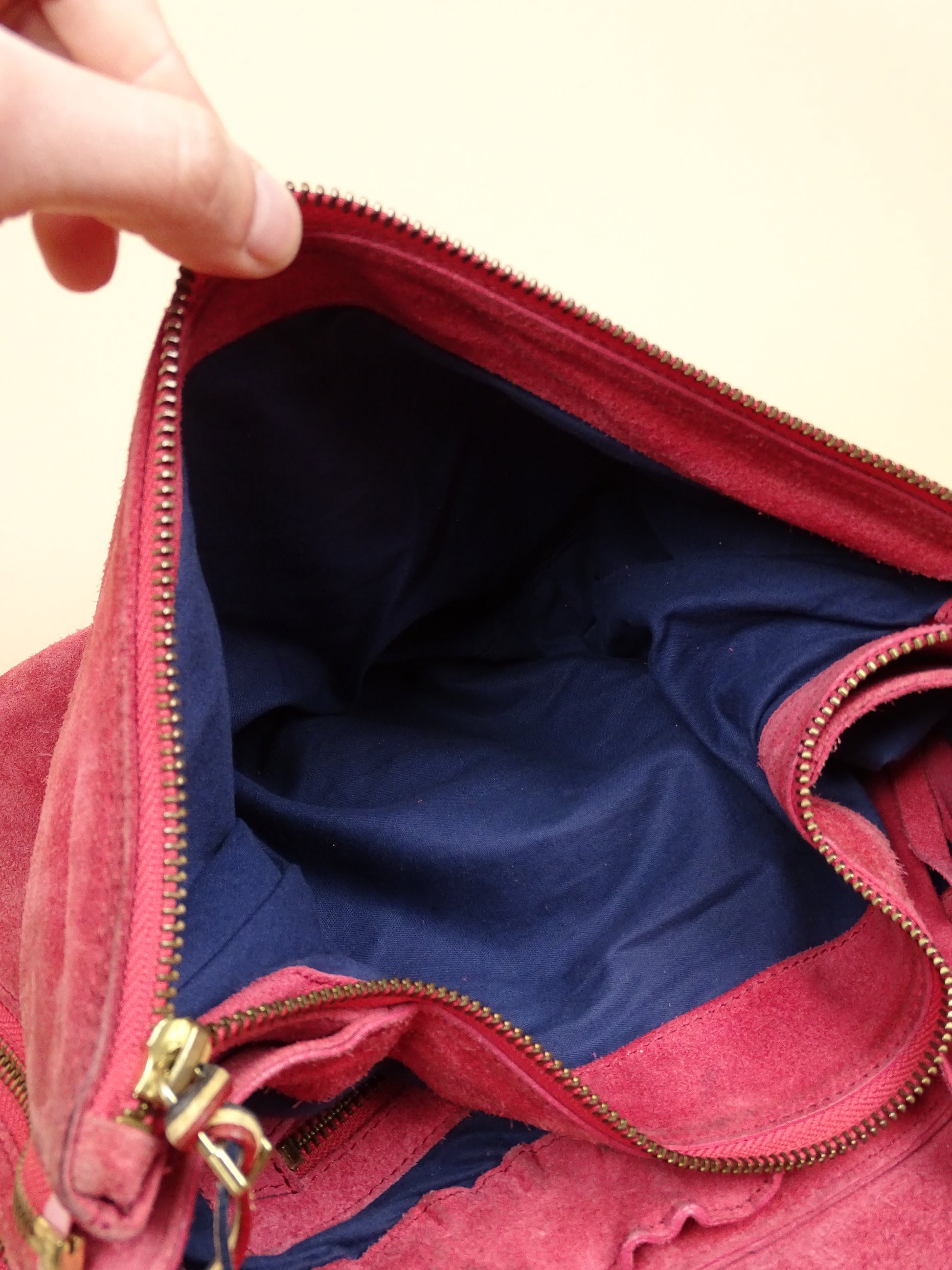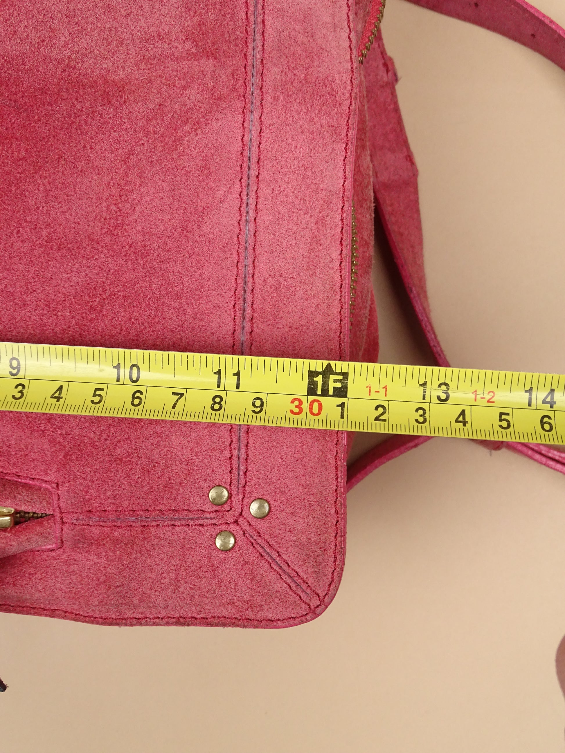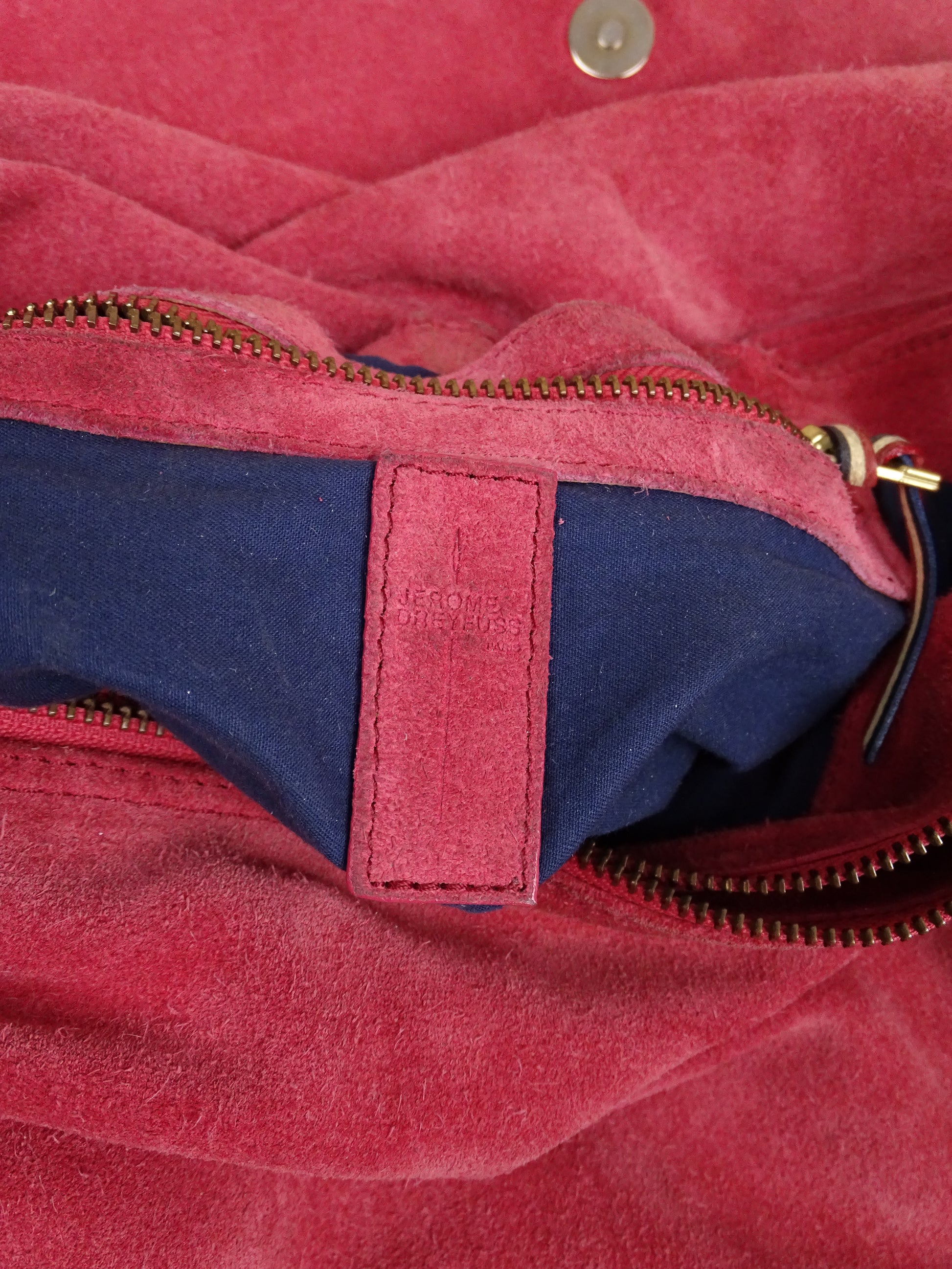 Sac Jérôme Dreyfuss modèle Albert, pour femmes, en daim rose. Le sac est en bon état général, mais présente des signes d’usure visibles : le daim est un peu usé, notamment à l’arrière, la lampe intégrée n’a plus de pile, et un petit trou est présent à l’avant.