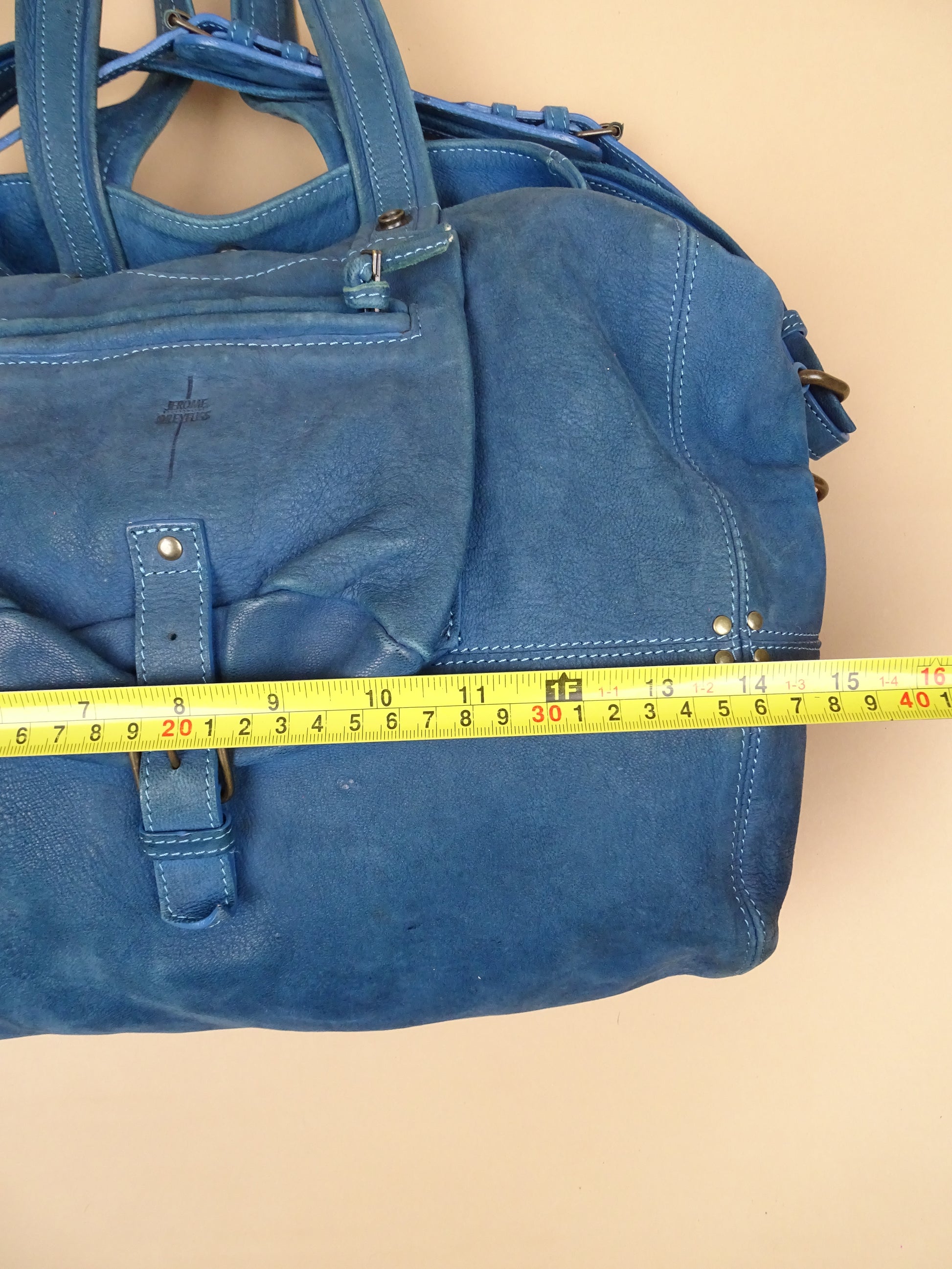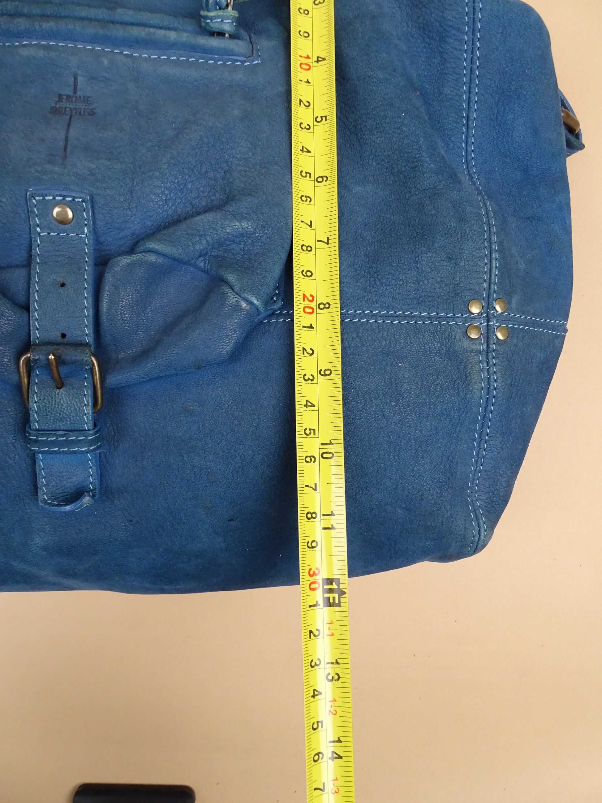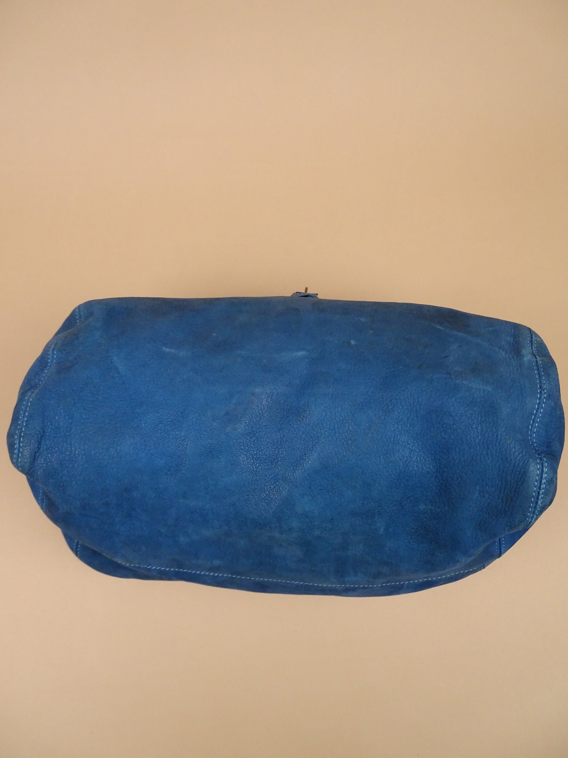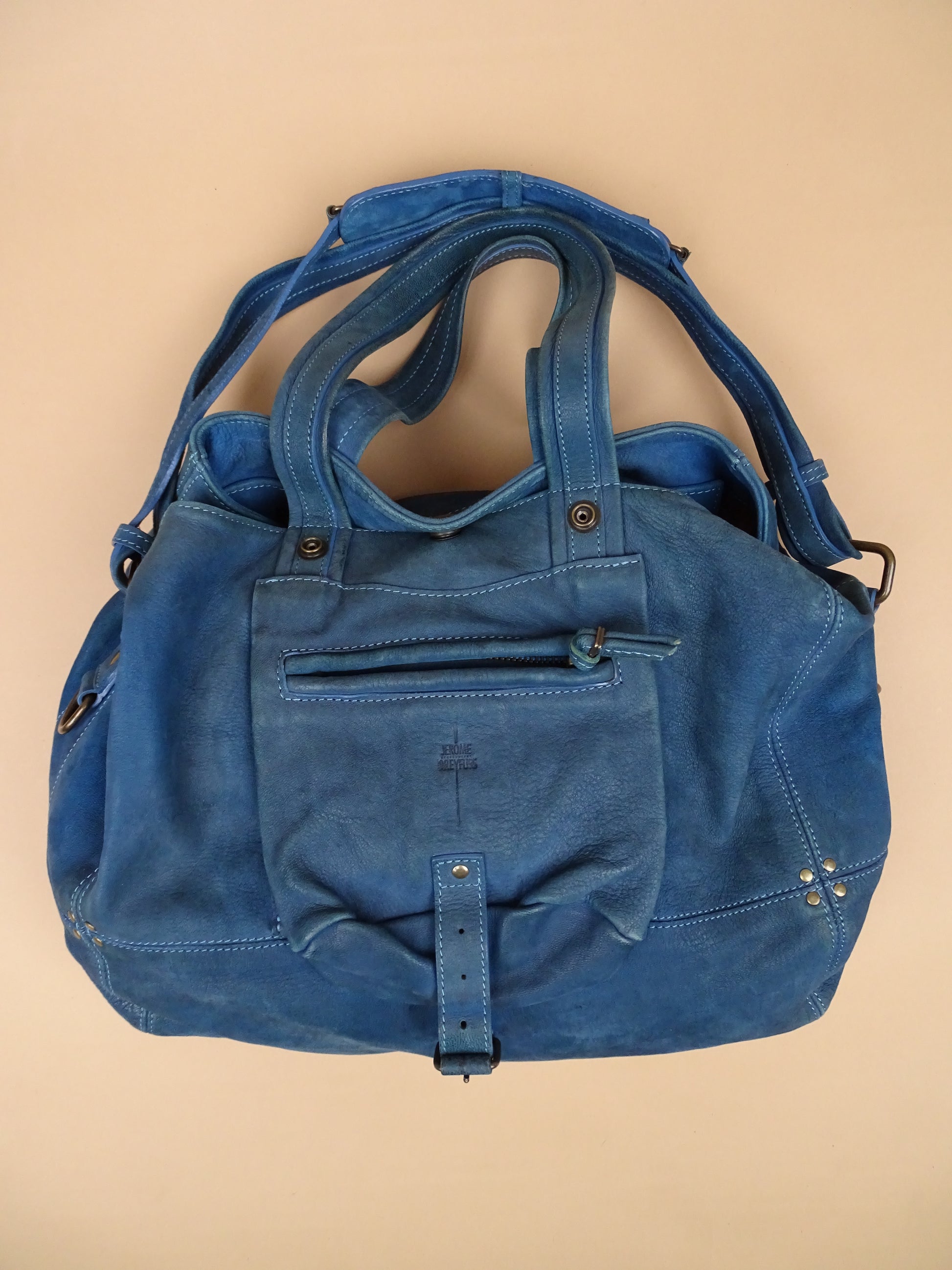 Sac Jérôme Dreyfuss modèle Billy, taille M, en cuir bleu turquoise. Condition de l’article : Le cuir est doux au toucher, mais présente des signes d’usure avec quelques traces visibles, notamment sous le sac (voir photos). L’intérieur est très propre et en excellent état. La lampe intégrée n’a plus de pile.
