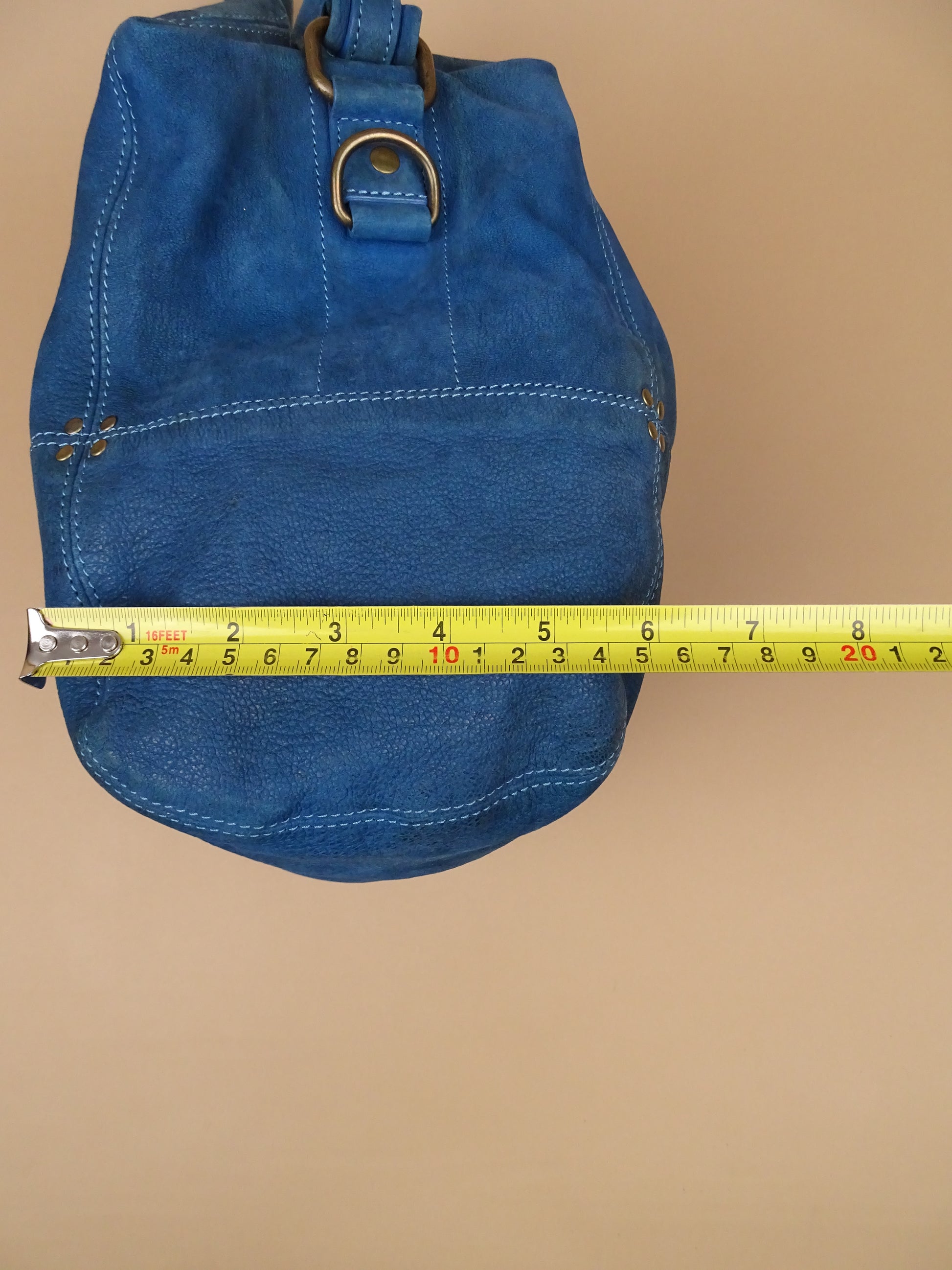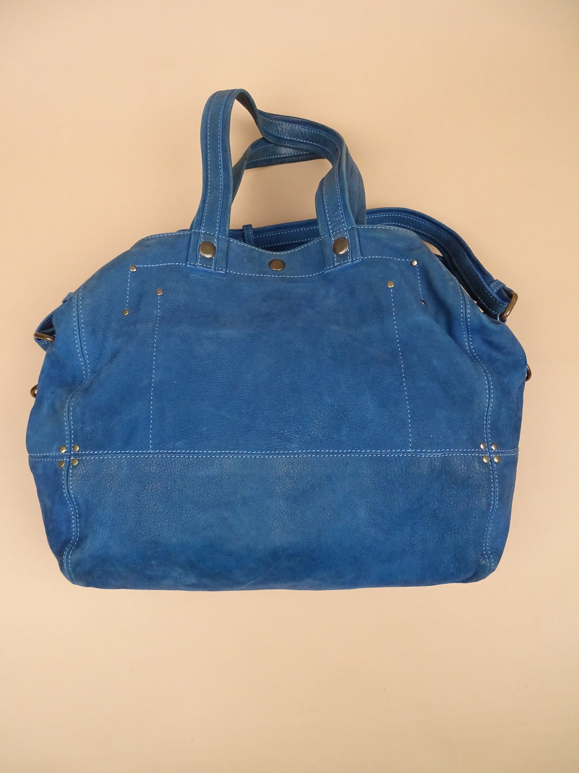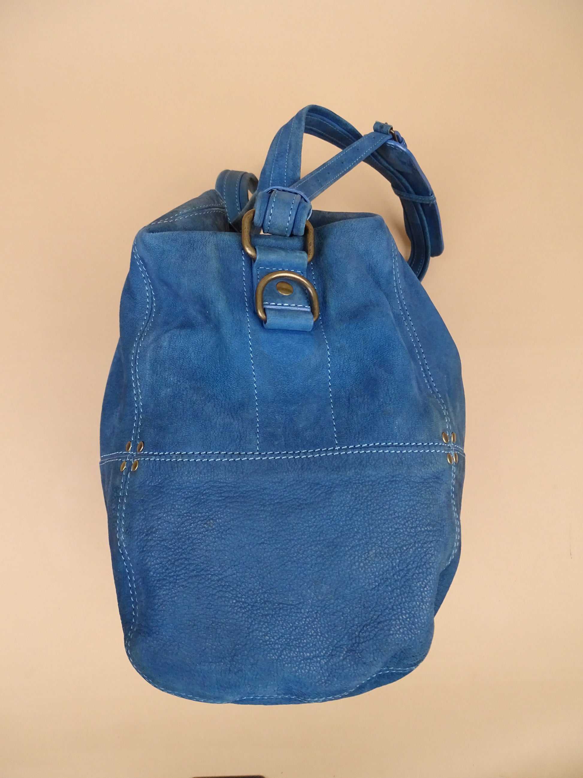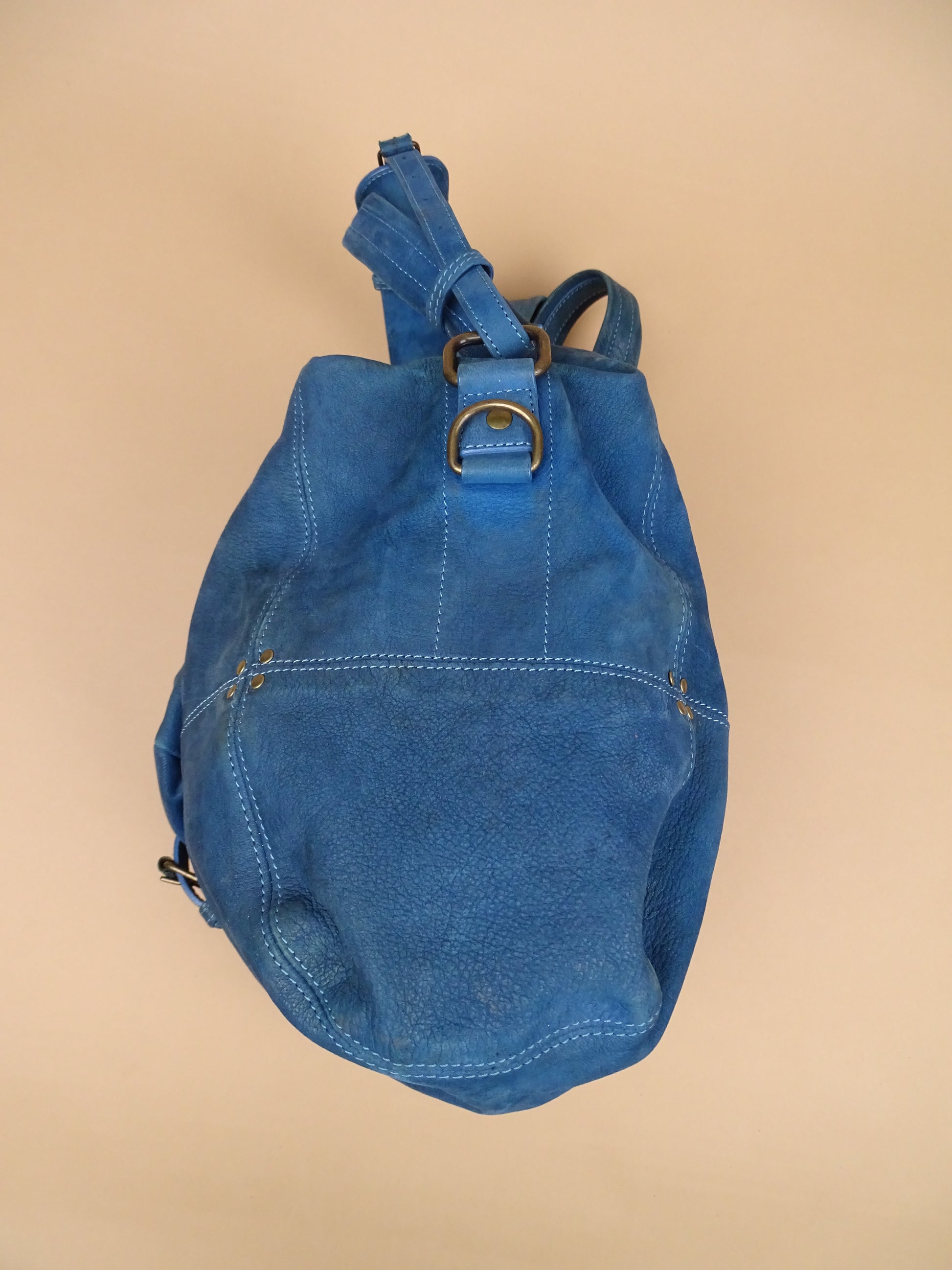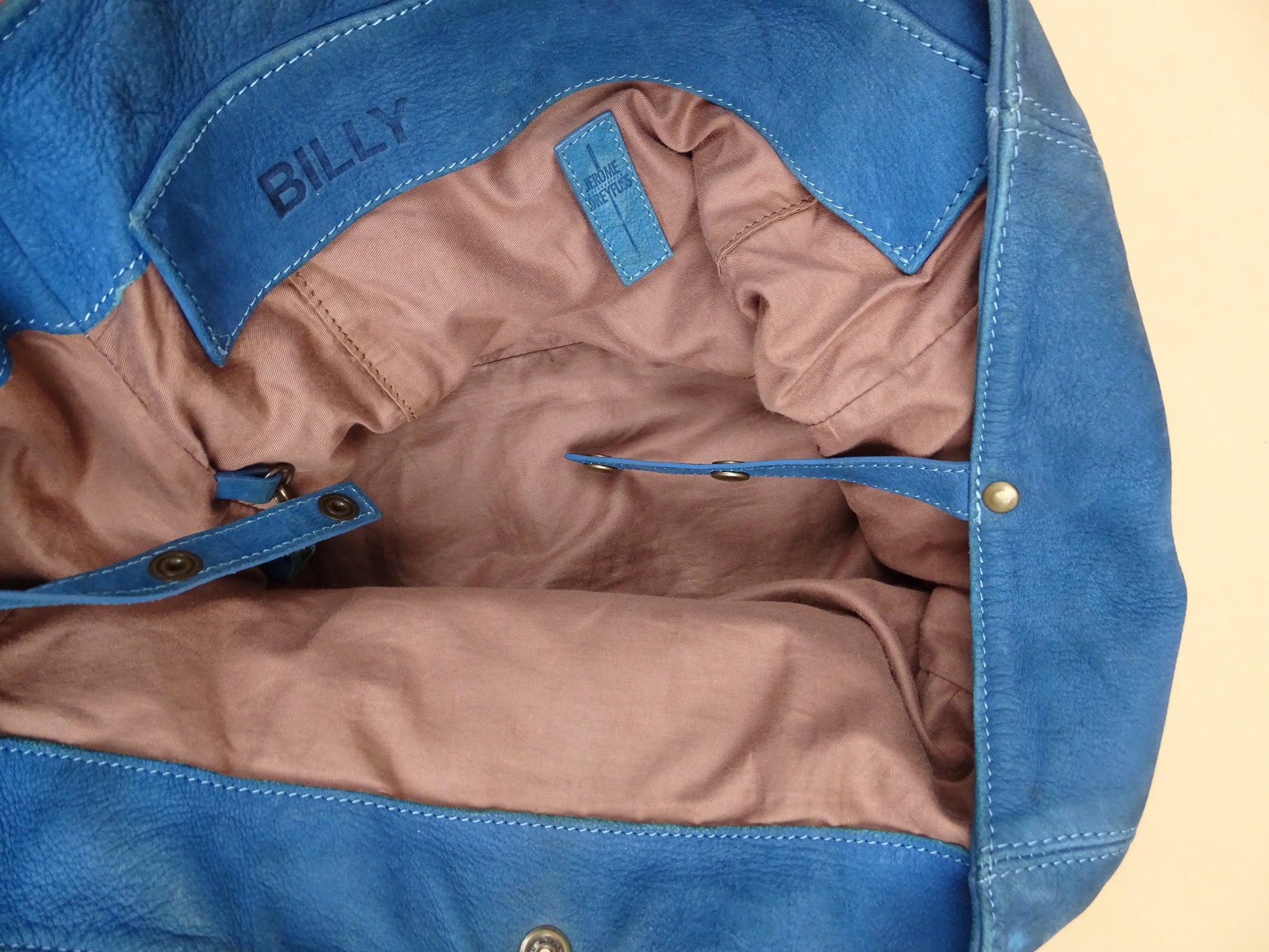 Sac Jérôme Dreyfuss modèle Billy, taille M, en cuir bleu turquoise. Condition de l’article : Le cuir est doux au toucher, mais présente des signes d’usure avec quelques traces visibles, notamment sous le sac (voir photos). L’intérieur est très propre et en excellent état. La lampe intégrée n’a plus de pile.