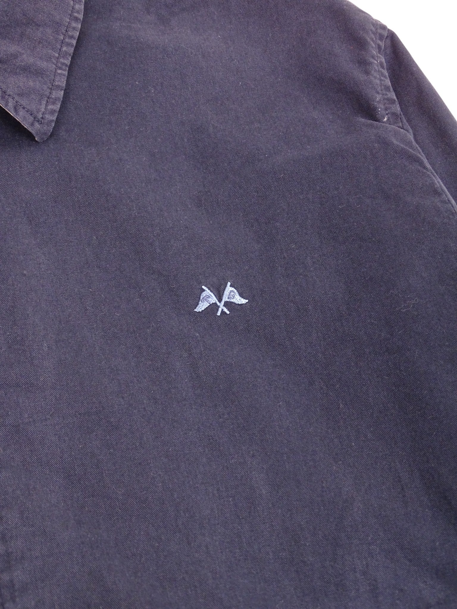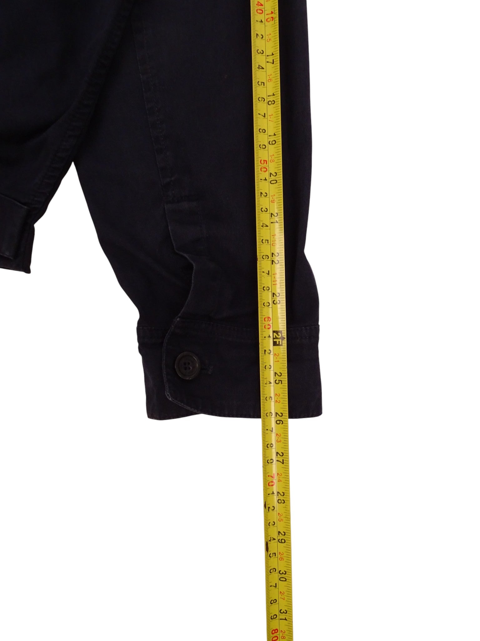 Veste Harrington Burberry bleu marine, taille L homme. Présente une trace sur la poche avant, un col légèrement délavé et un bouton arrière cassé. Reste en bon état général (voir photos).