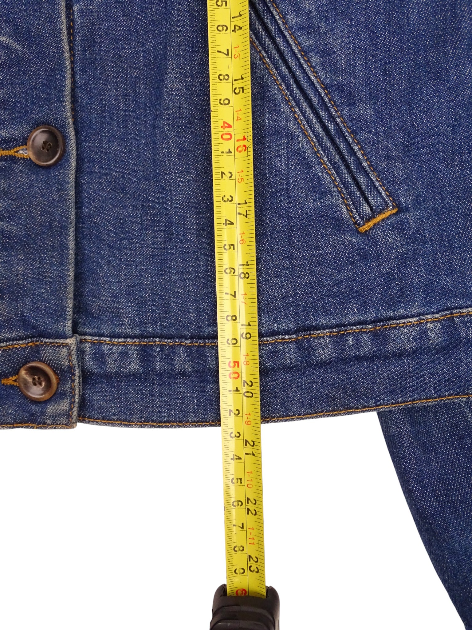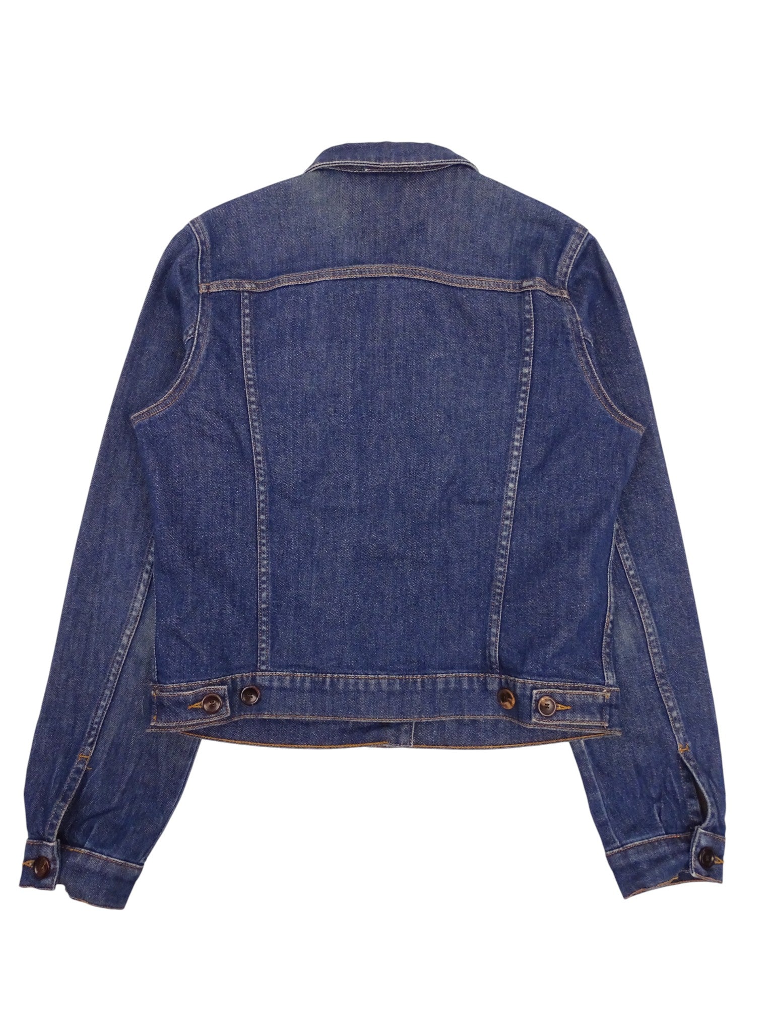 Veste en jean Soeur, 98 % coton, taille 38 / M femme. Très bon état général (voir photos). Un bouton de devant est manquant mais il y a celui de rechange fourni
