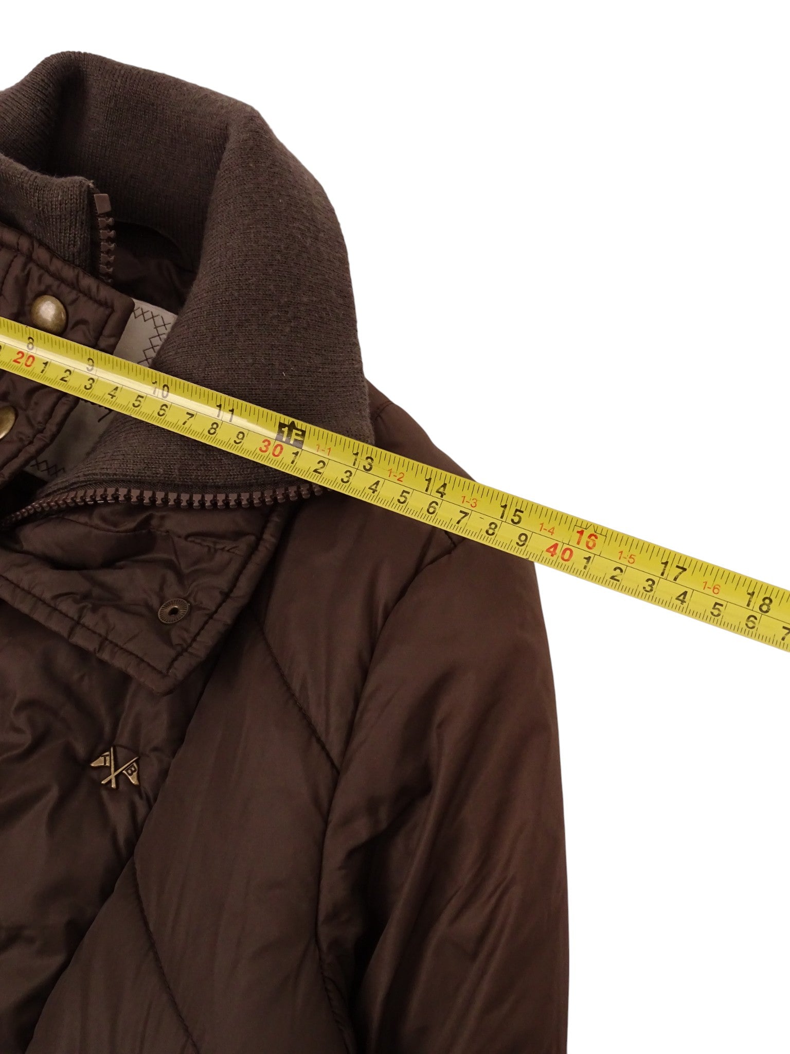 Doudoune courte Burberry marron, double zip, taille XS femme. Très bon état général, aucun défaut ; le nom de l’ancienne propriétaire est simplement inscrit sur l’étiquette (voir photos).
