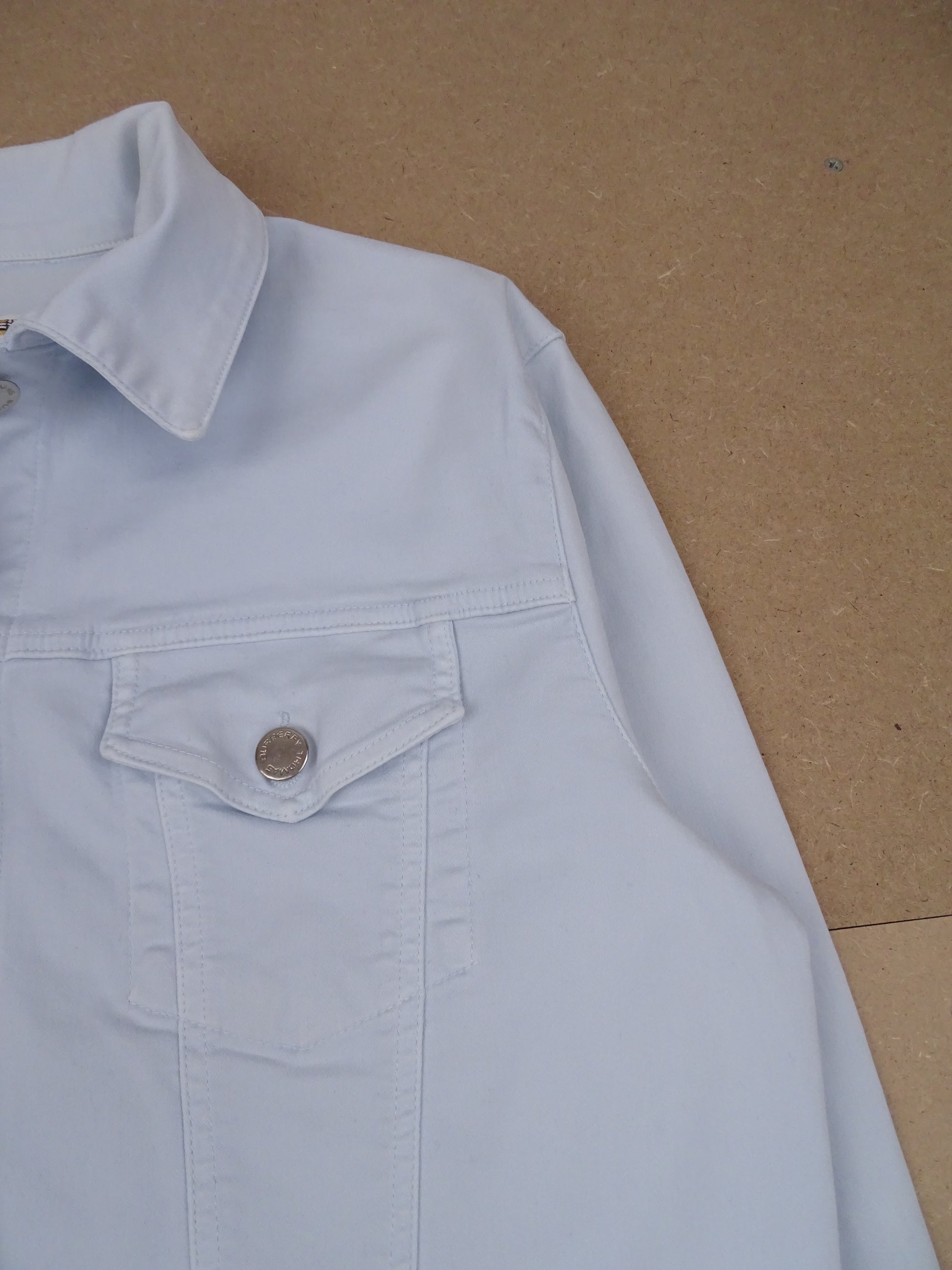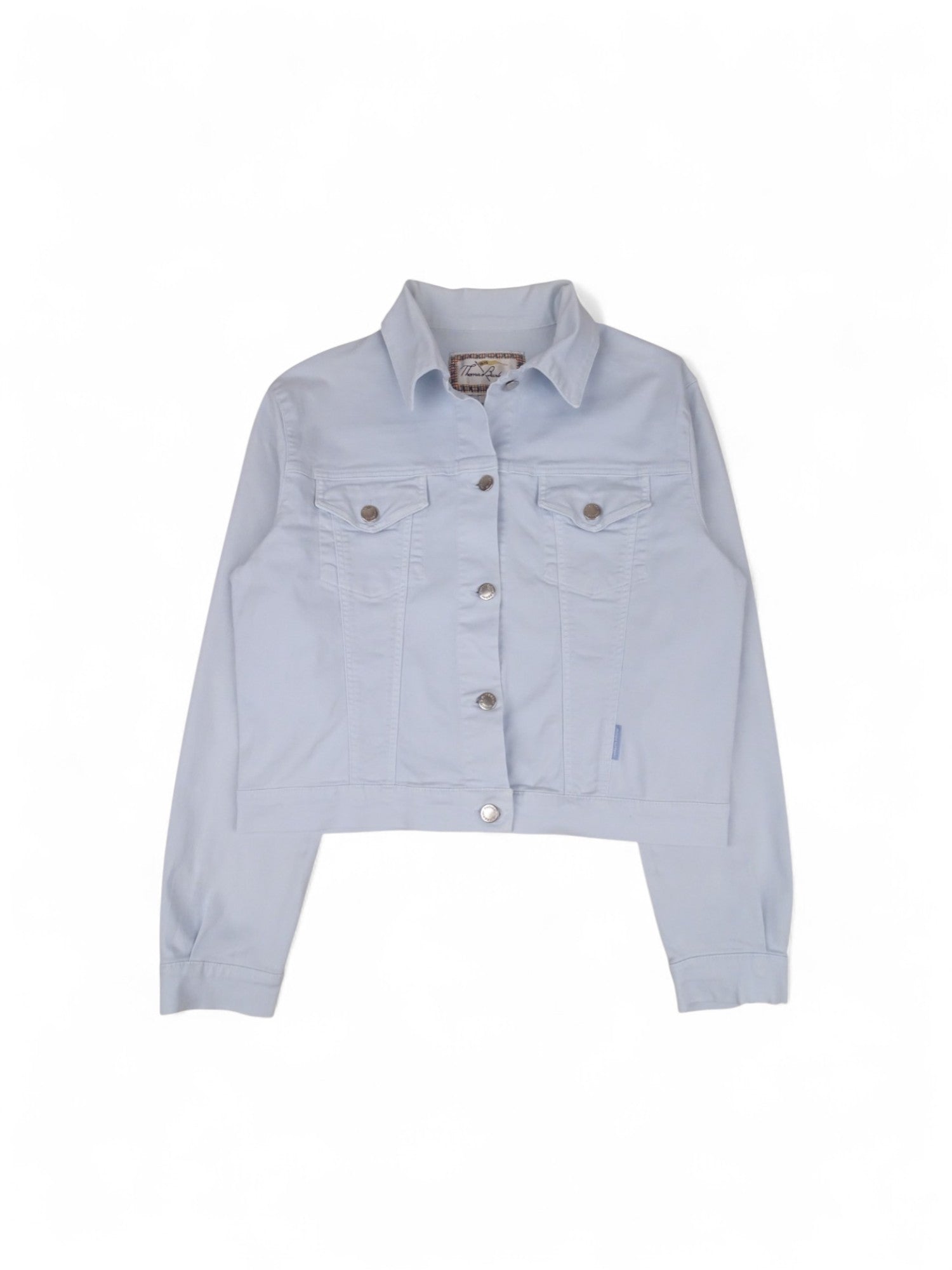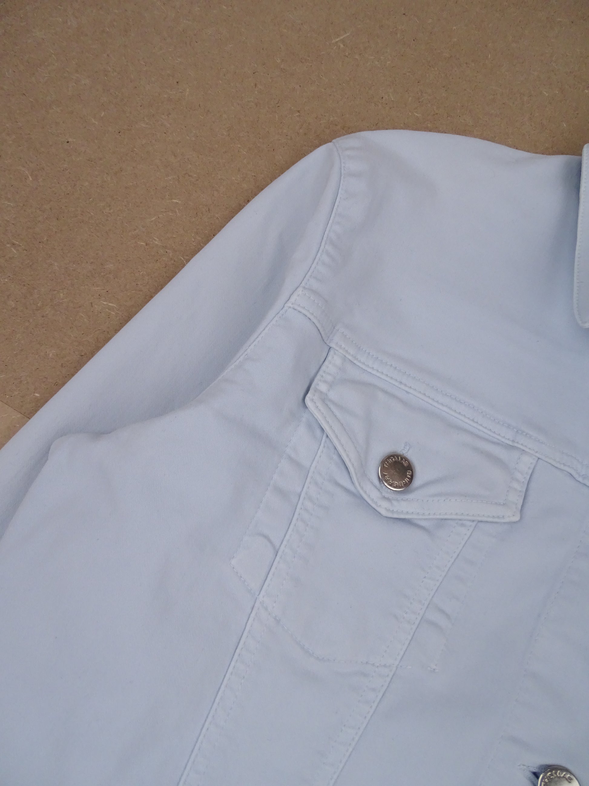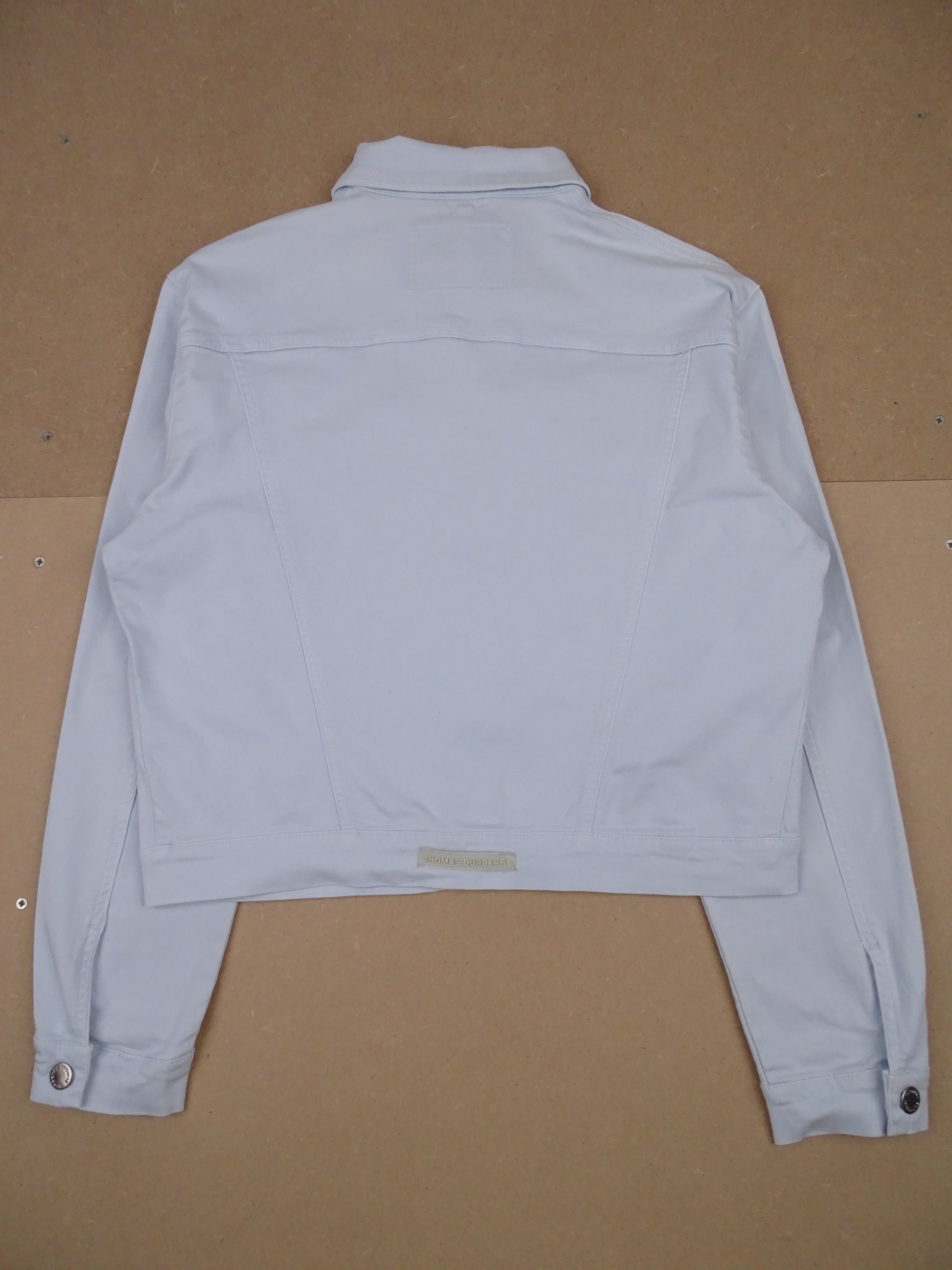 Veste Burberry en coton, taille M femme, de couleur bleu clair. Bon état général, quelques petites traces discrètes à l’arrière visibles sur les photos. Coupe chic et décontractée. Condition de l’article : Bon état, petites traces à l’arrière.